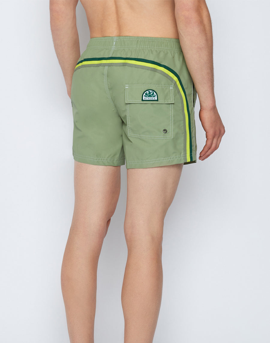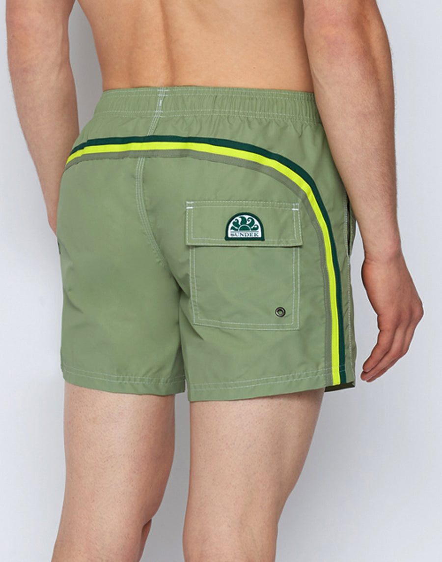 Pantalones cortos de mar para hombre con cintura elástica, cordón y el icónico arcoíris de Sundek en la espalda. Este traje de baño está hecho con costuras de tres agujas y 100% de nuestro tejido heritage, nylon-tafetán: suave como la seda, ligero y resistente a todo, se seca muy rápido para brindarte comodidad en todas partes, en las olas y fuera del agua. Longitud 35 cm (tamaño M), medido en el lado externo de la pierna.