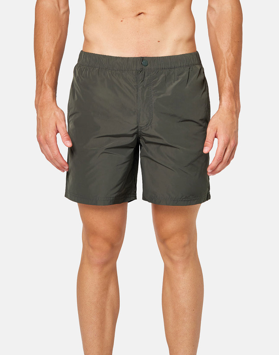 Bañador de hombre de largo medio y cierre frontal con botón a presión, cremallera termosellada para cerrar el bolsillo trasero y arcoíris en la parte trasera del mismo color que el bañador. Ligero, resistente, se seca rápidamente y mantiene su forma en el tiempo gracias al tejido técnico de poliéster con memoria. Tiene nuestro clásico cosido a tres agujas que aumenta la resistencia al estrés.