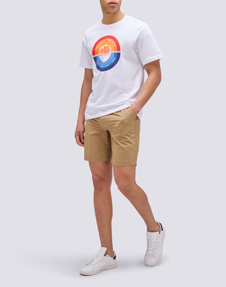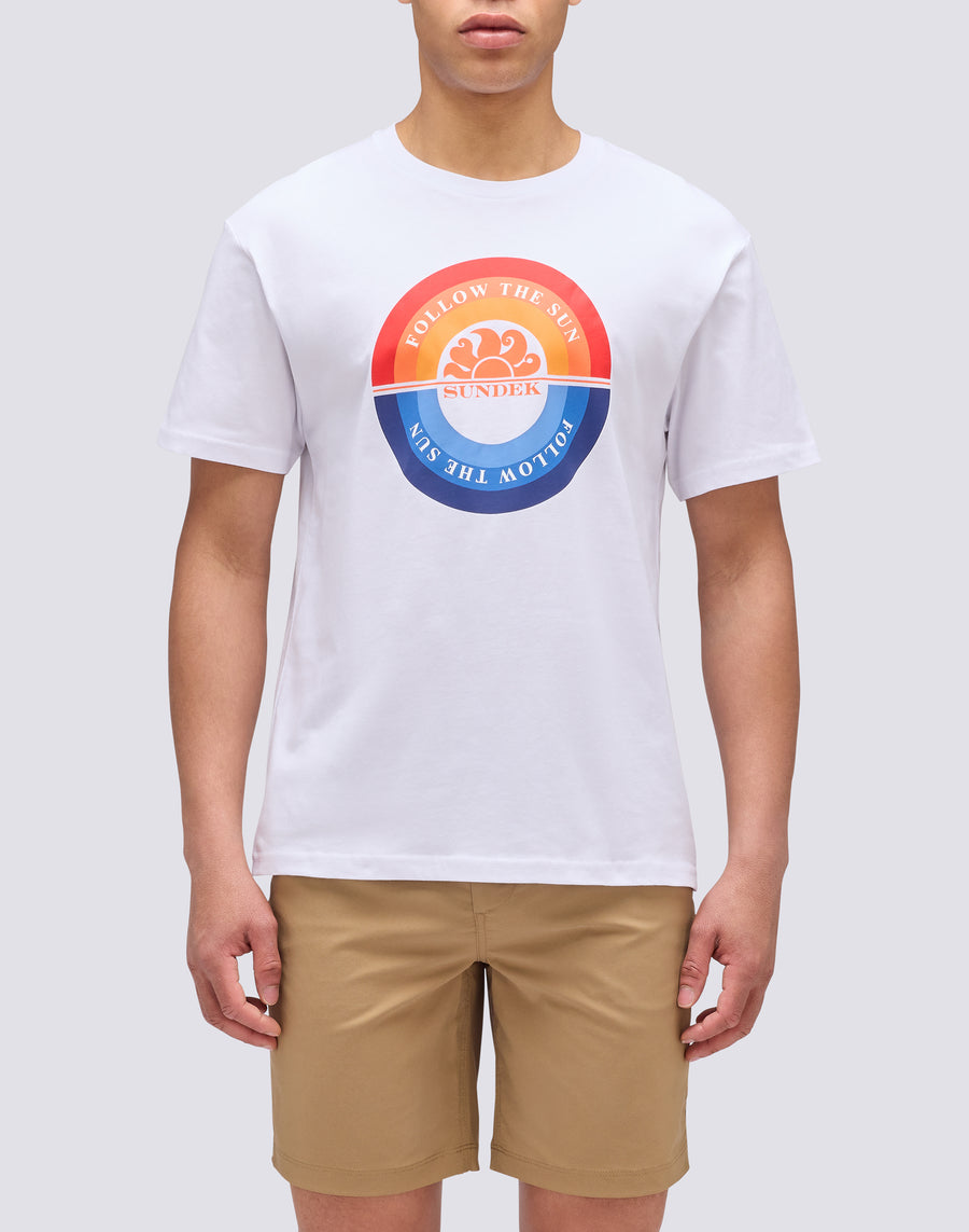 Camiseta de manga corta para hombre, confeccionada en algodón con un estampado frontal redondo muy llamativo y colorido, con la inscripción SUNDEK FOLLOW THE SUN. Para tus outfits de primavera/verano, combínala con bermudas, pantalones largos o, por qué no, sobre tu bañador favorito.