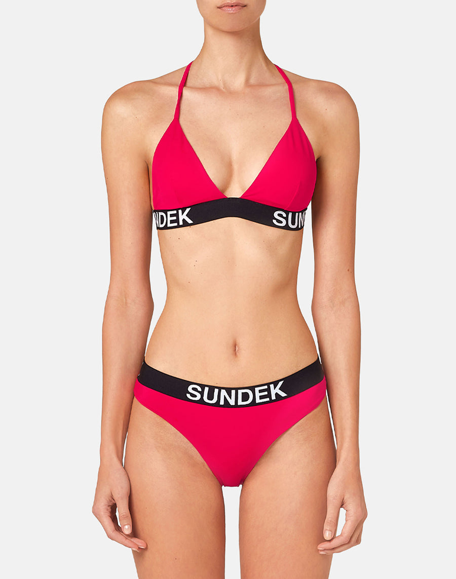 Top triangular ajustable que combina feminidad y atractivo deportivo, para un look de playa dinámico resaltado por la banda elástica con logo en contraste. Siempre perfecto gracias al tejido VITA by Carvico que soporta todos los movimientos y no teme al contacto con el cloro, las cremas solares y los aceites.