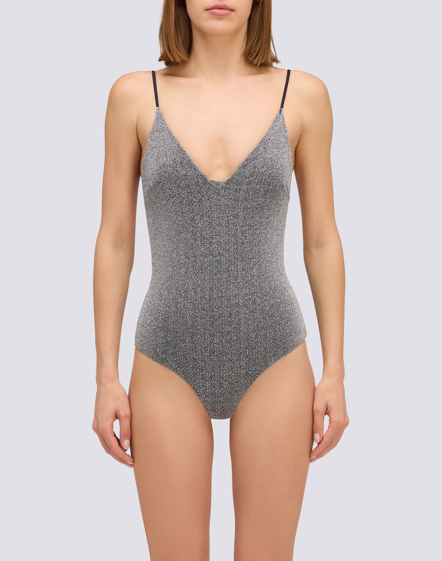 La elegancia cobra protagonismo en este bañador de una pieza de lúrex, para llevar en la playa pero también en diferentes contextos, para crear llamativos conjuntos veraniegos. Los cordones cruzados en la espalda crean una línea fluida y sofisticada.