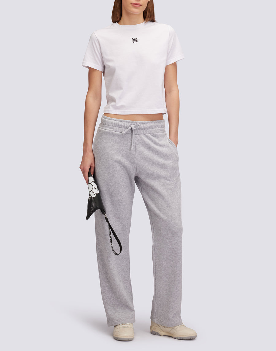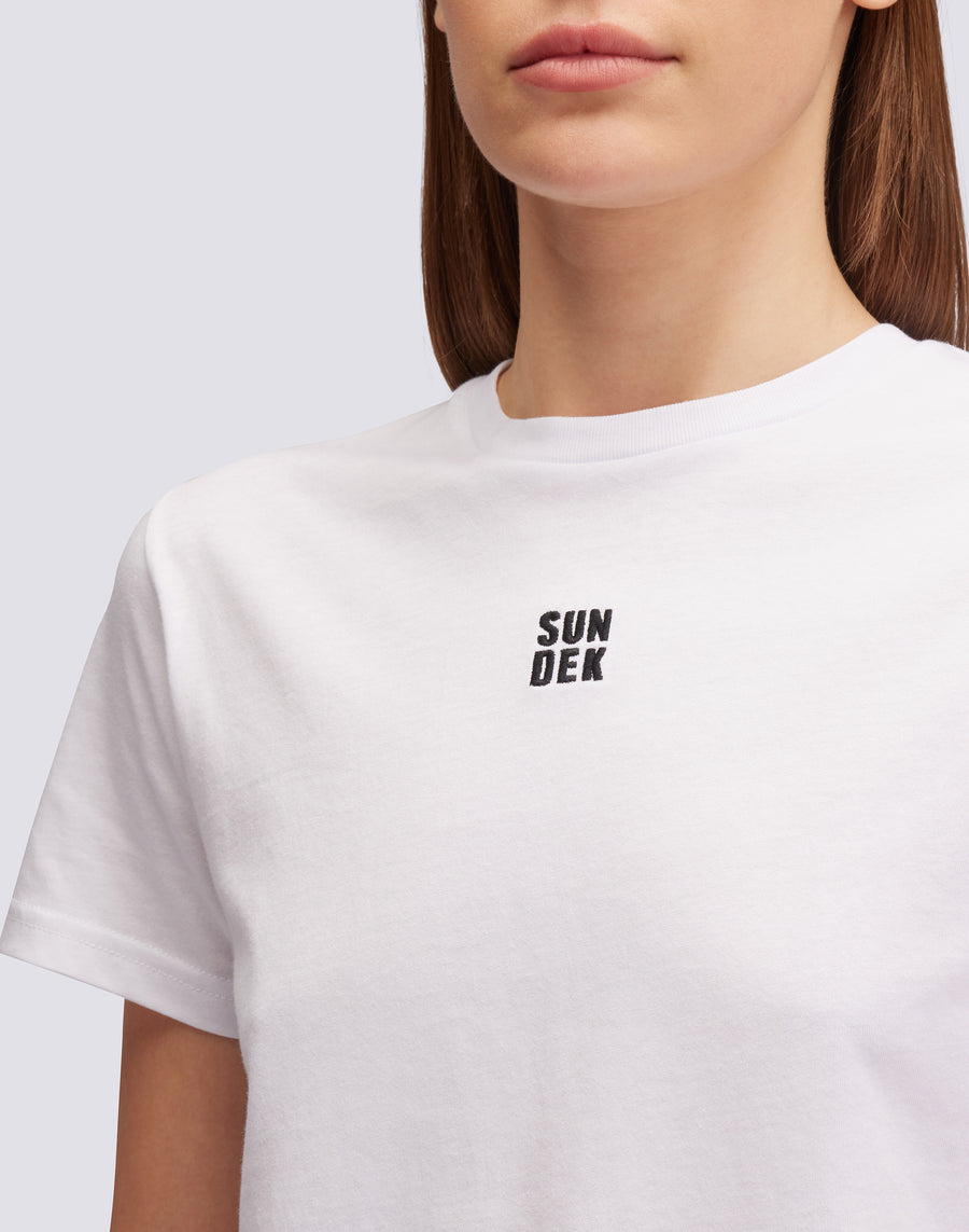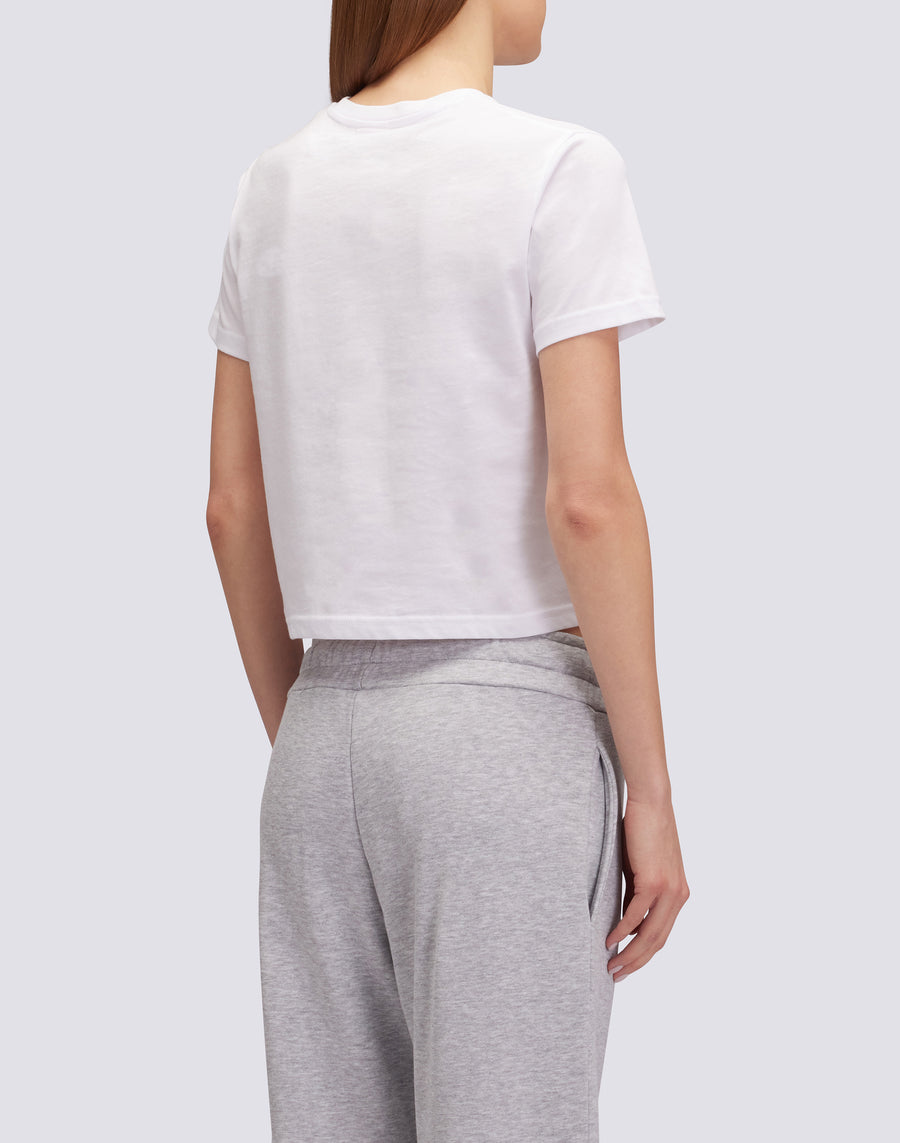 Camiseta de mujer con corte crop y estilo deportivo, perfecta para looks informales, para llevar en la playa sobre el bañador, combinada con pantalones cortos o para actividades al aire libre.