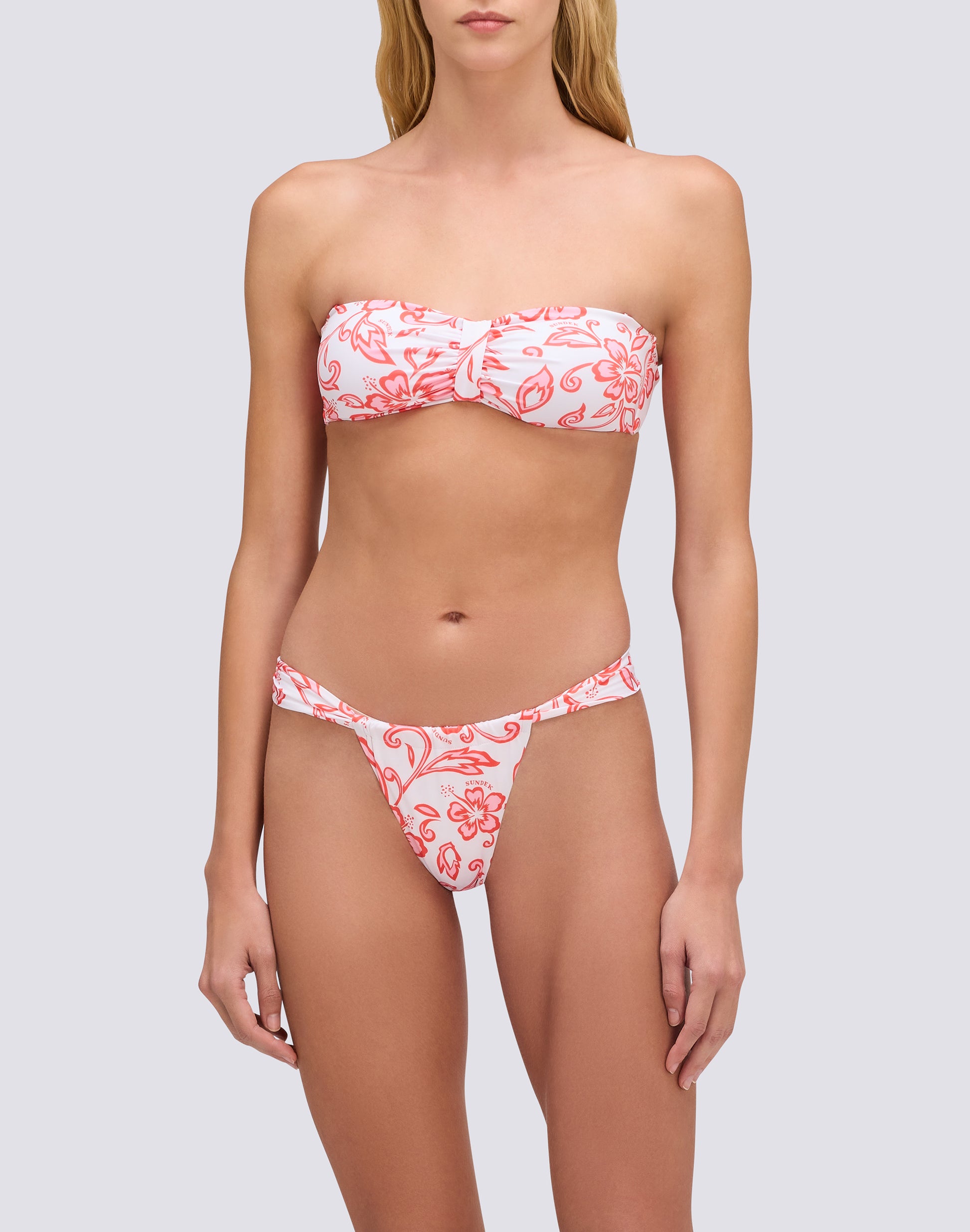El top bandeau se caracteriza por una banda de tela que envuelve el busto sin tirantes. Puede ser recto, entallado, con o sin fruncidos, y suele tener un cierre trasero con corchetes o lazos. La ausencia de tirantes lo hace ideal para evitar marcas de bronceado en los hombros. Se adapta a diferentes estilos, desde los más deportivos hasta los más elegantes, dependiendo del tejido, el estampado y las combinaciones. La banda suele ser ideal para pechos pequeños o medianos, especialmente los modelos con relleno o fruncidos que crean un efecto óptico de mayor volumen. El bikini bandeau ofrece múltiples posibilidades de combinación para crear looks de playa a la última. También puedes añadir collares de varias vueltas o pendientes colgantes para dar un toque de estilo. Es una opción elegante y versátil para la playa, ideal para quienes desean un bronceado uniforme y aman un estilo limpio.
