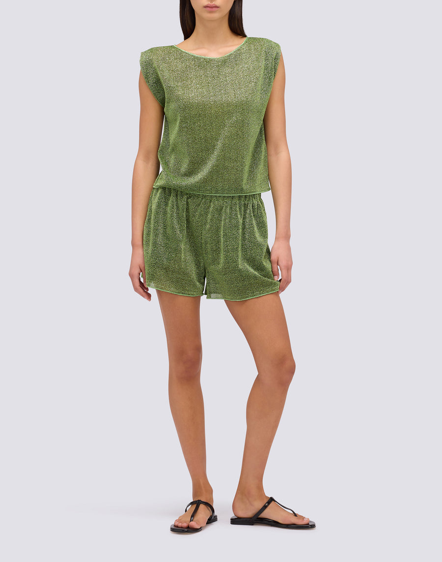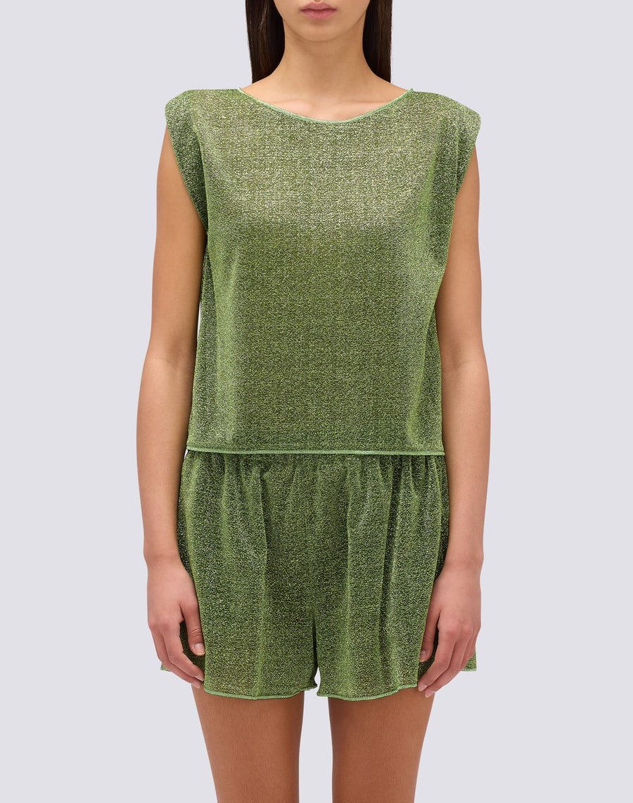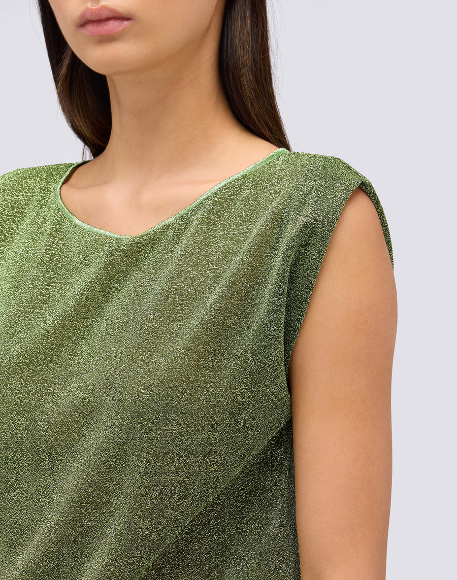 Esta camiseta de mujer en lúrex es perfecta para crear looks brillantes. Combínala con unos shorts o unos pantalones a juego y añade un toque de glamour a tu estilo. Está confeccionada en un tejido suave y es cómoda de llevar durante todo el día.