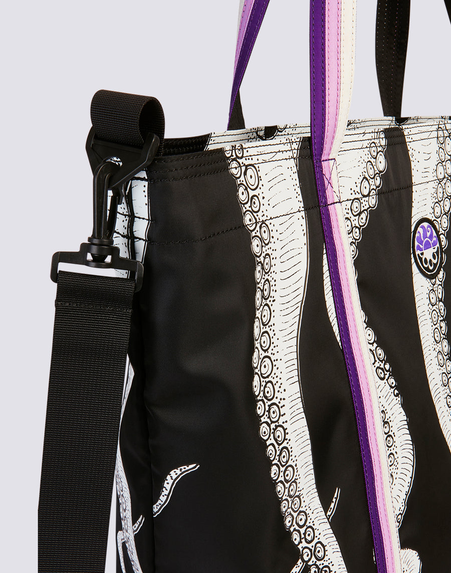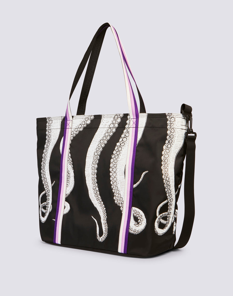 Ce sac de plage est né de la collaboration entre Sundek et Octopus. Incontournable grâce au détail des poignées d'épaule arc-en-ciel et à l'imprimé tentacule, polyvalent grâce à la bandoulière pour le porter comme vous préférez, c'est le sac cabas que vous pourrez emporter avec vous tout l'été : en vacances, en voyage et en ville , combiné avec vos tenues décontractées.