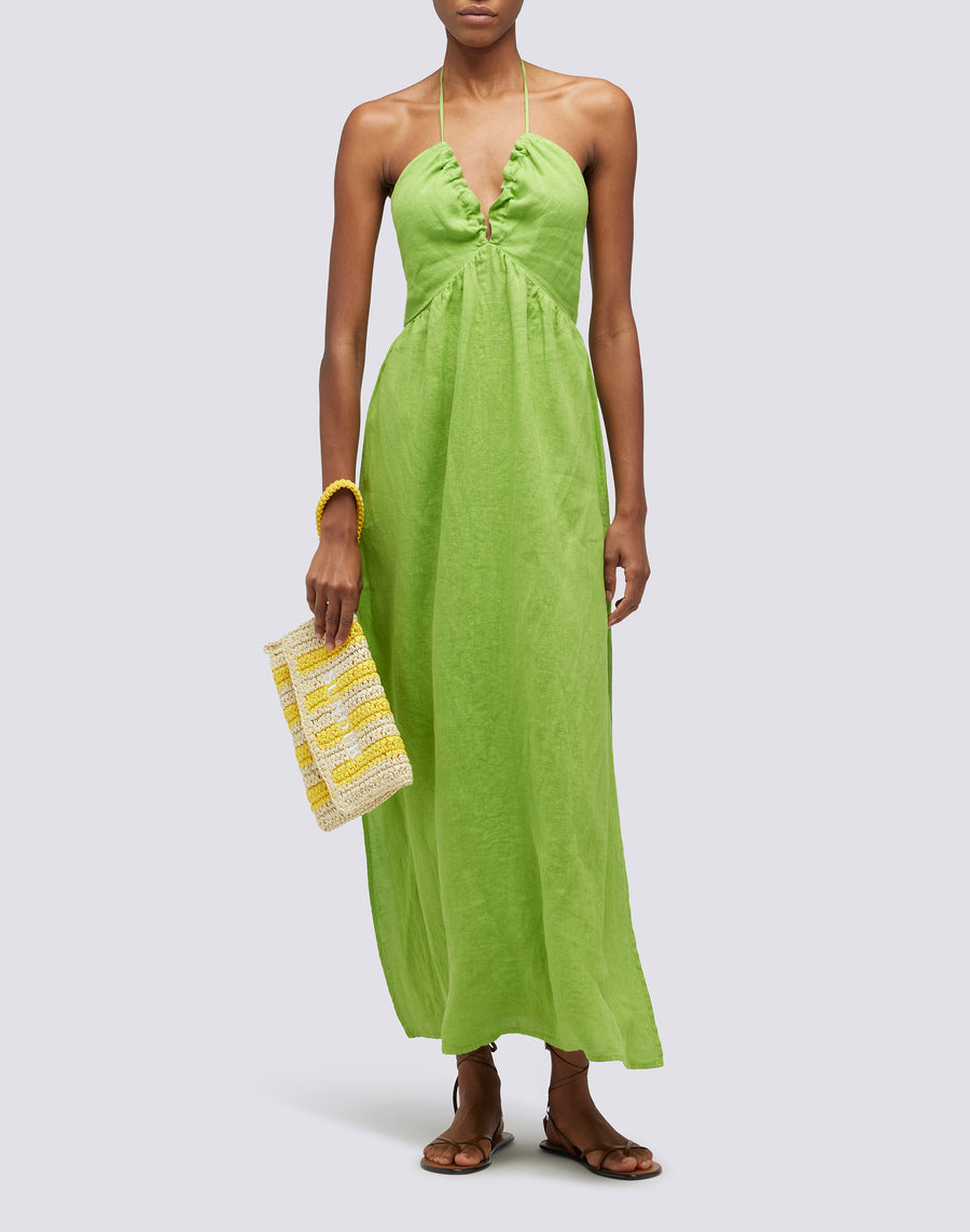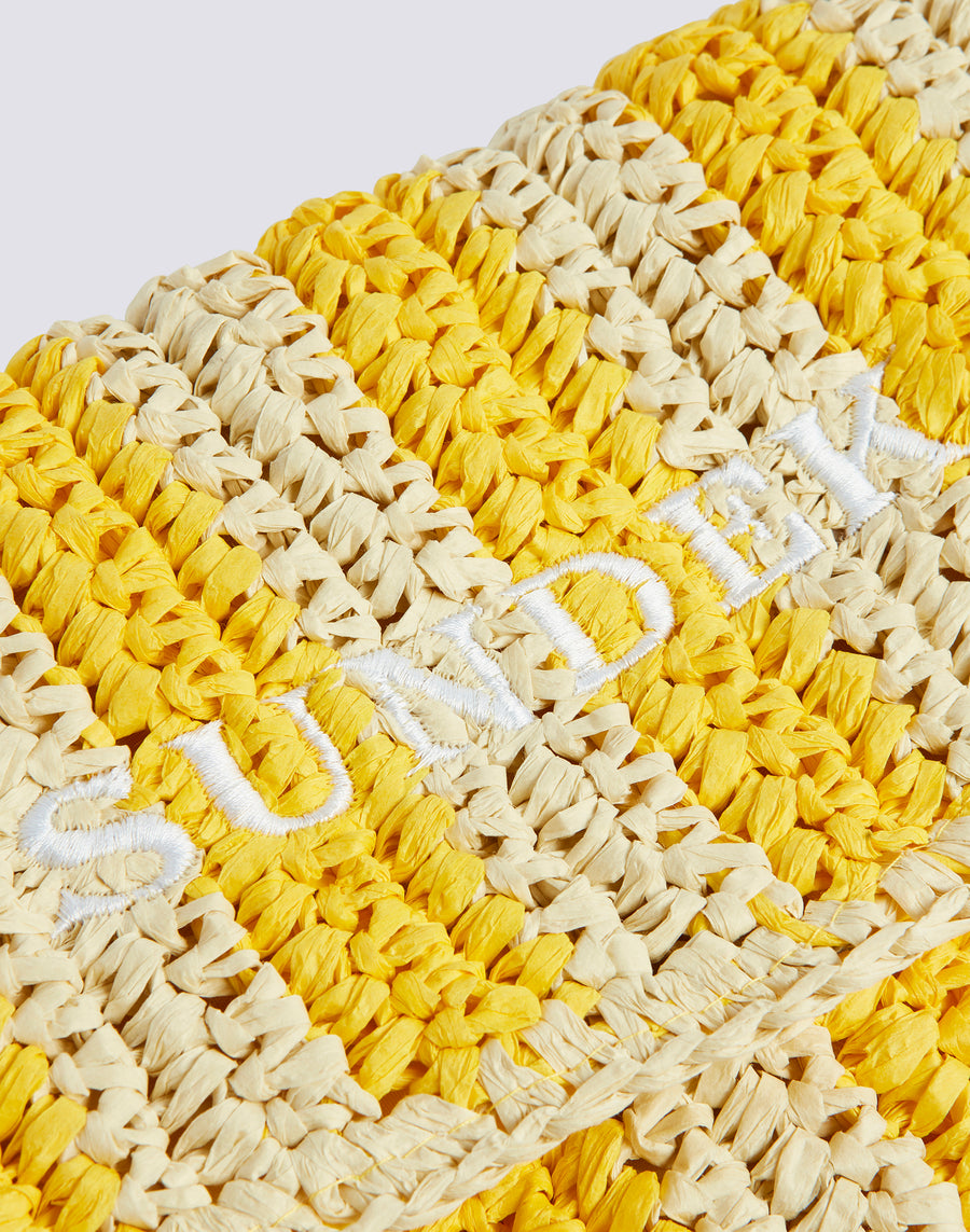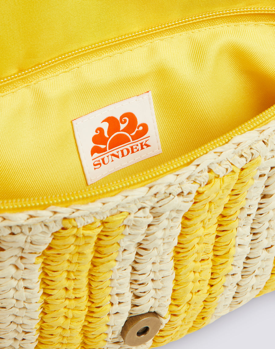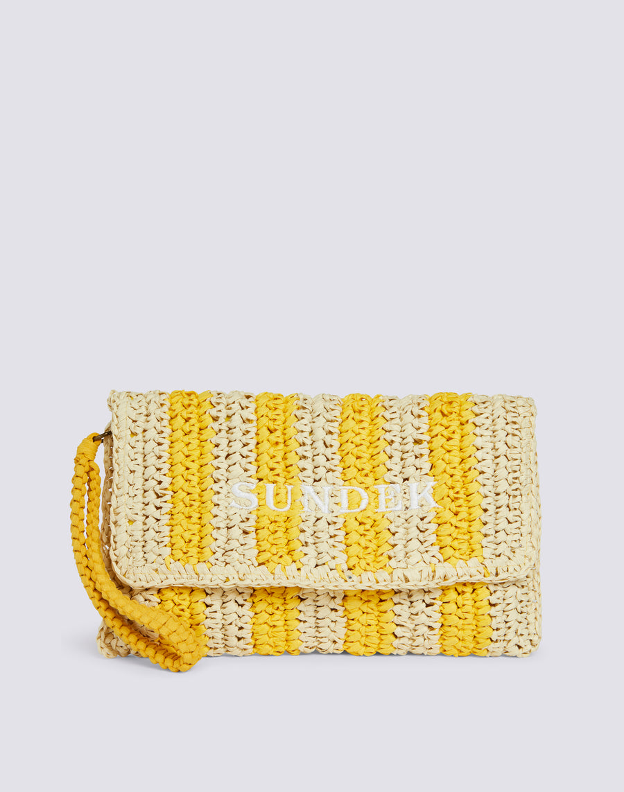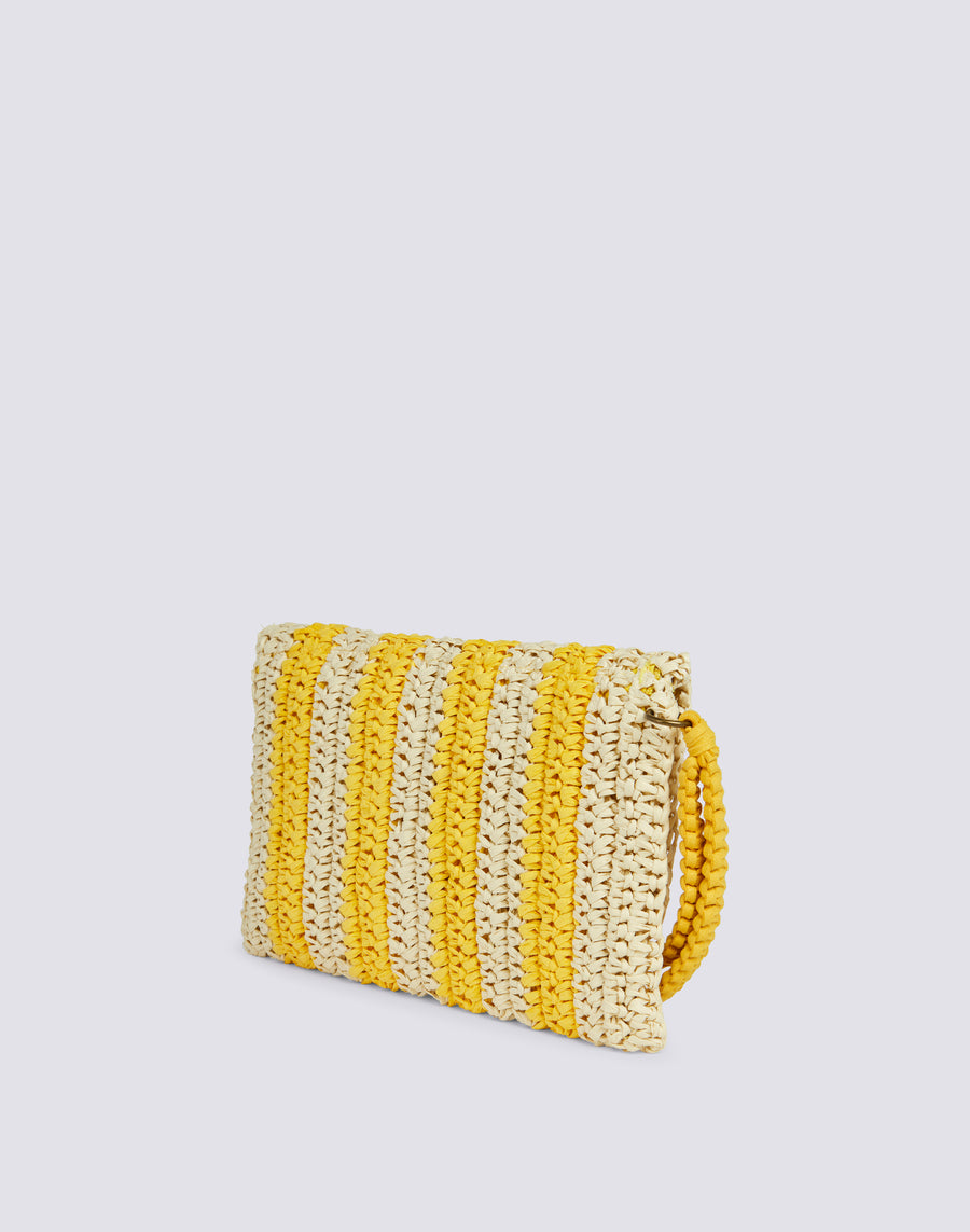 Pochette Izumi en papier effet paille à motif rayé. Equipé d'une dragonne, il est pratique à transporter grâce à sa petite taille. Le motif rayé le rend vivant et original.