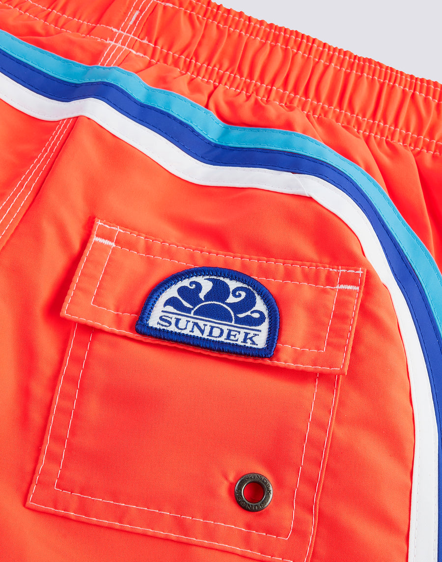 Couleurs intenses et tissu ultra-confortable et à séchage rapide pour ce short de plage pour enfants. Un modèle qui accompagnera votre enfant dans ses nombreuses activités en vacances, parfait pour se déplacer et jouer en toute liberté. Il est réalisé dans notre tissu historique nylon-taffetas et construit avec des coutures à trois aiguilles qui le rendent durable. A emballer année après année.