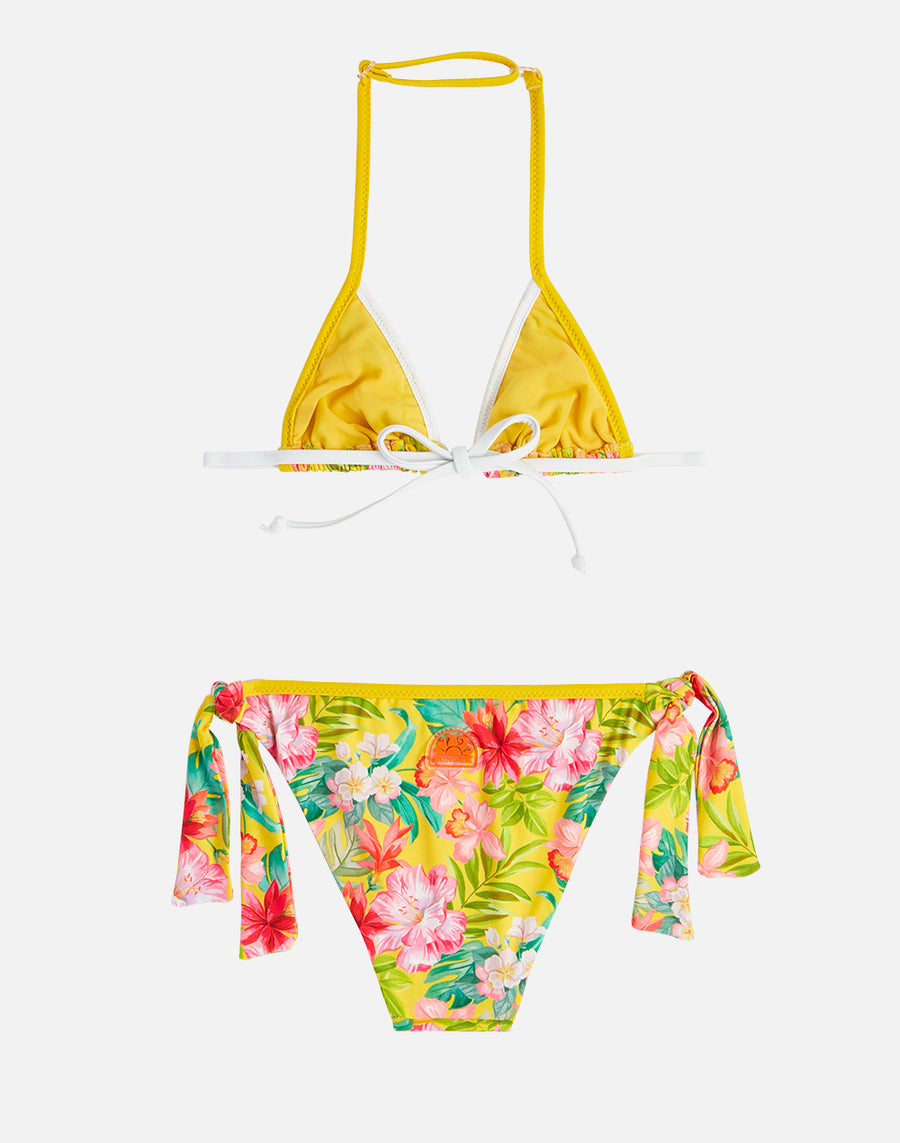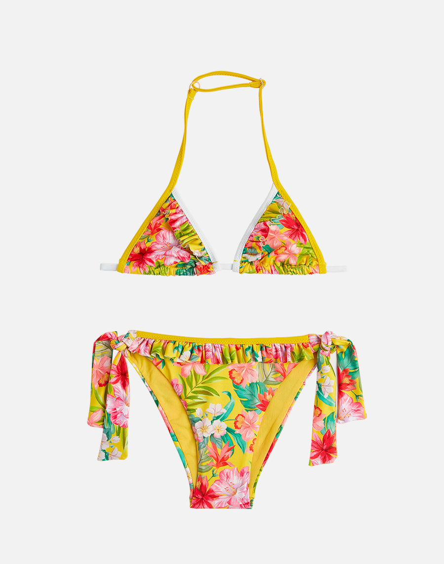 Des couleurs vives et un imprimé fleuri d'inspiration hawaïenne pour ce bikini fille. Top à lacets ajustables et slip avec nœuds ajustables sur les côtés.