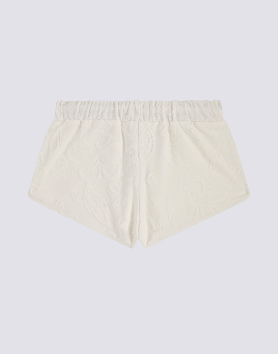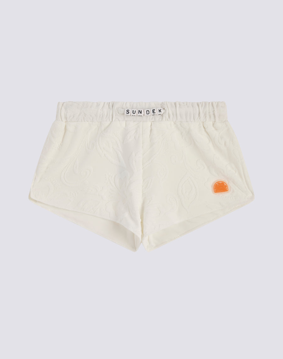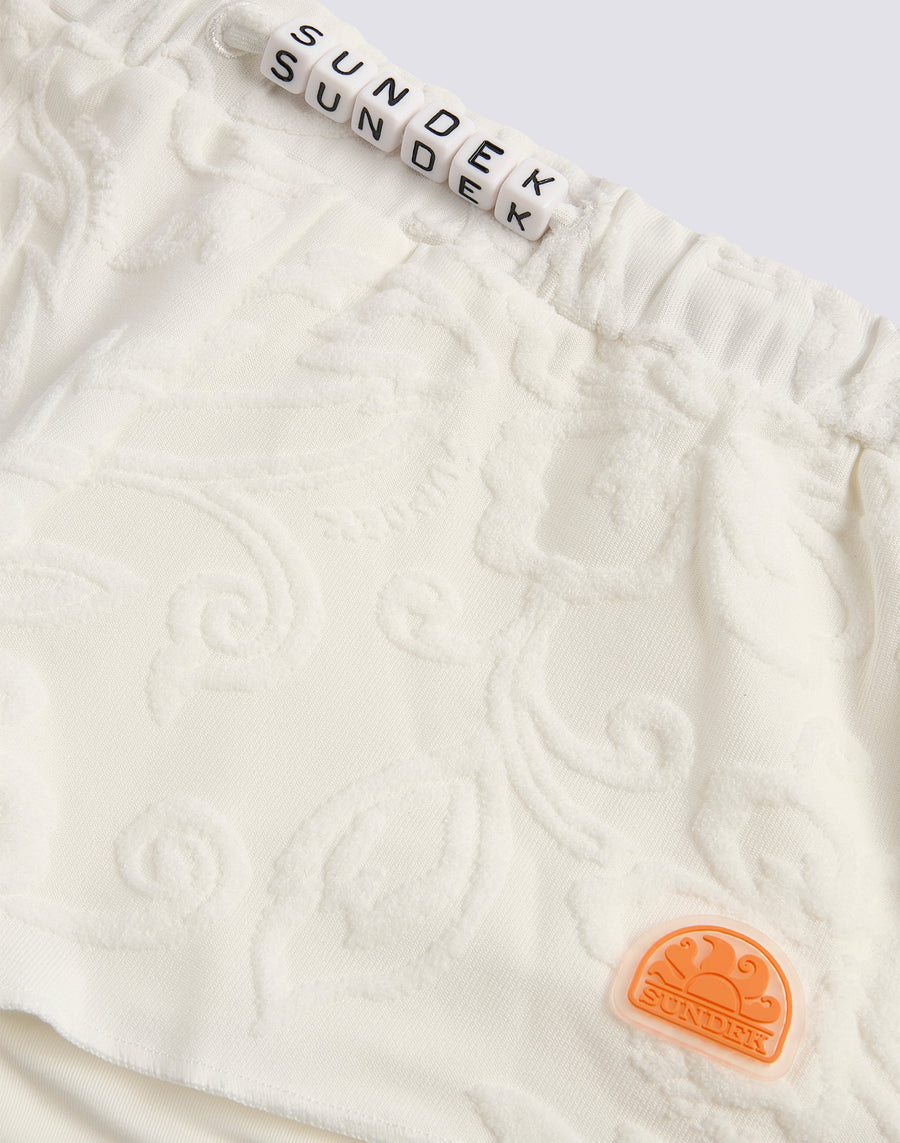 Short pour fille en éponge jacquard avec motif SK23. Doté d'une taille élastiquée et d'un cordon de serrage, il est parfait pour être porté sur le bikini à motifs assorti.