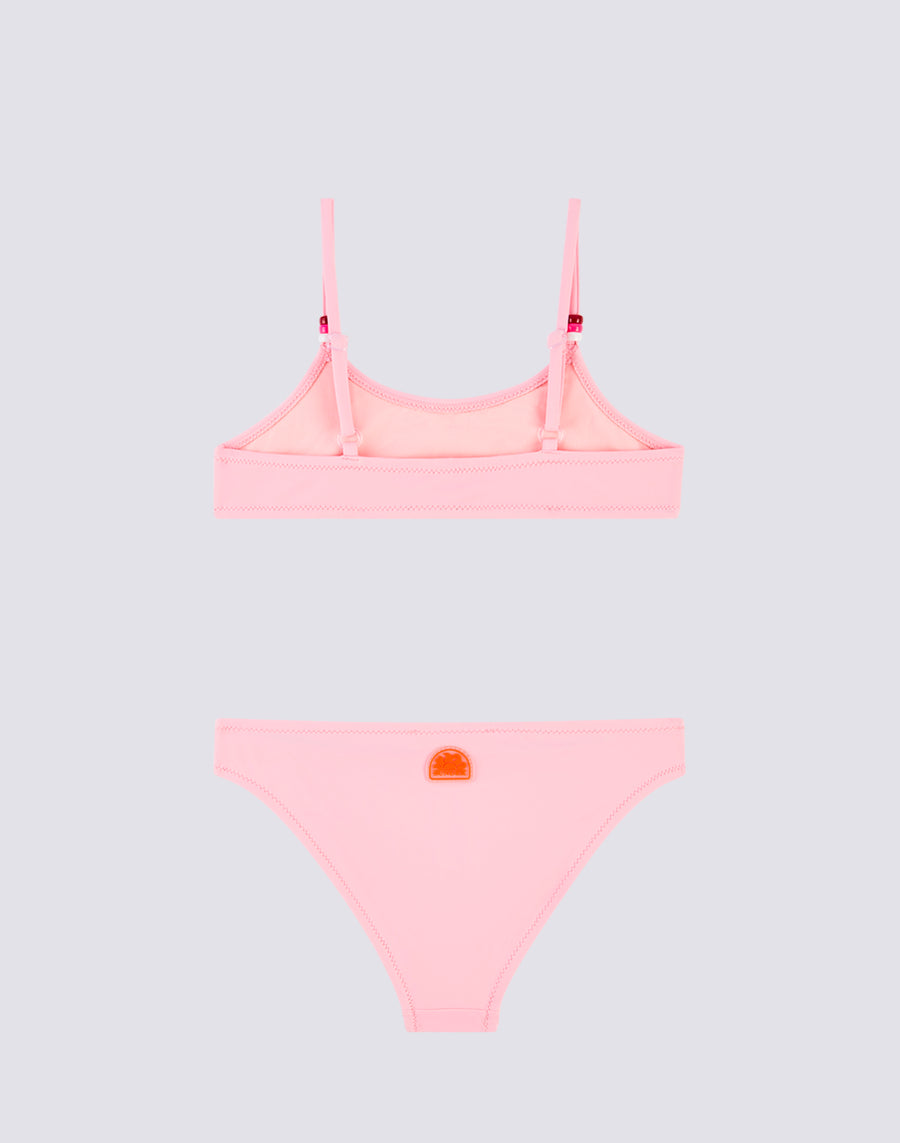 Bikini de plage petite fille avec haut ajustable à lacets agrémenté de perles. La couleur des perles est reproduite sur le détail tricolore de la culotte. Le maillot de bain deux pièces est fabriqué dans un tissu VITA by Carvico confortable et résistant, résistant au chlore et aux crèmes solaires.