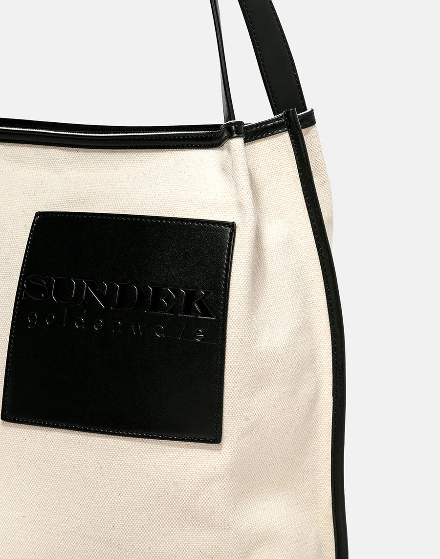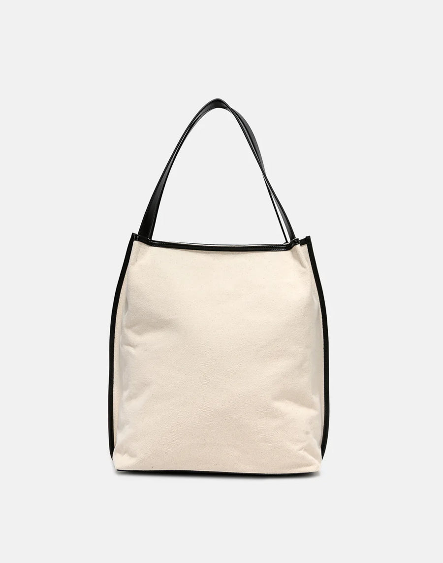 Tote bag spacieux en toile de coton avec détails en similicuir contrastés. Deux confortables anses d'épaule. Poche plaquée contrastée sur le devant avec logo.