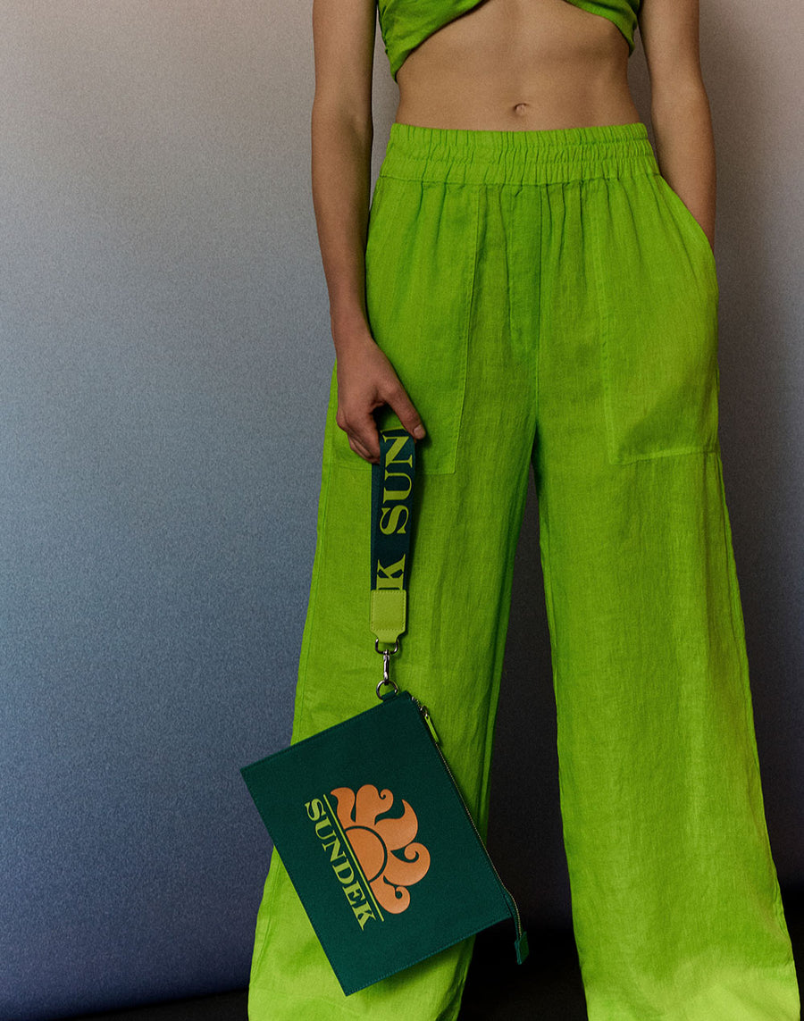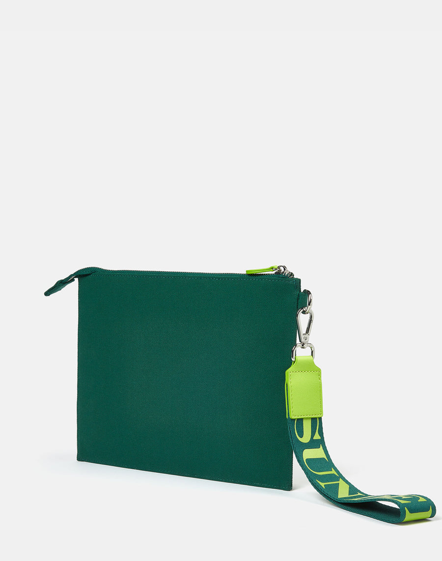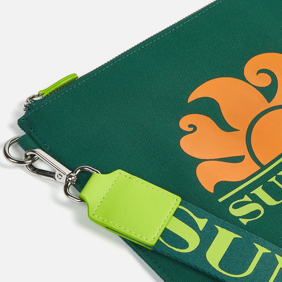 Pochette clutch en toile avec logo sundek imprimé. Parfaite à la fois comme trousse de toilette et comme pochette à main. Lanière avec logo amovible.