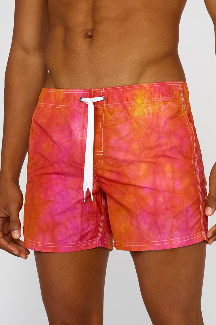Préparez-vous à surfer sur la prochaine vague avec le maillot de bain court à taille élastique avec traitement spécial tie-dye, traité et teint selon des techniques artisanales. Le tissu historique en taffetas de nylon et la construction à motifs font qu'il sèche rapidement et est très résistant saison après saison. Coupe taille basse.
