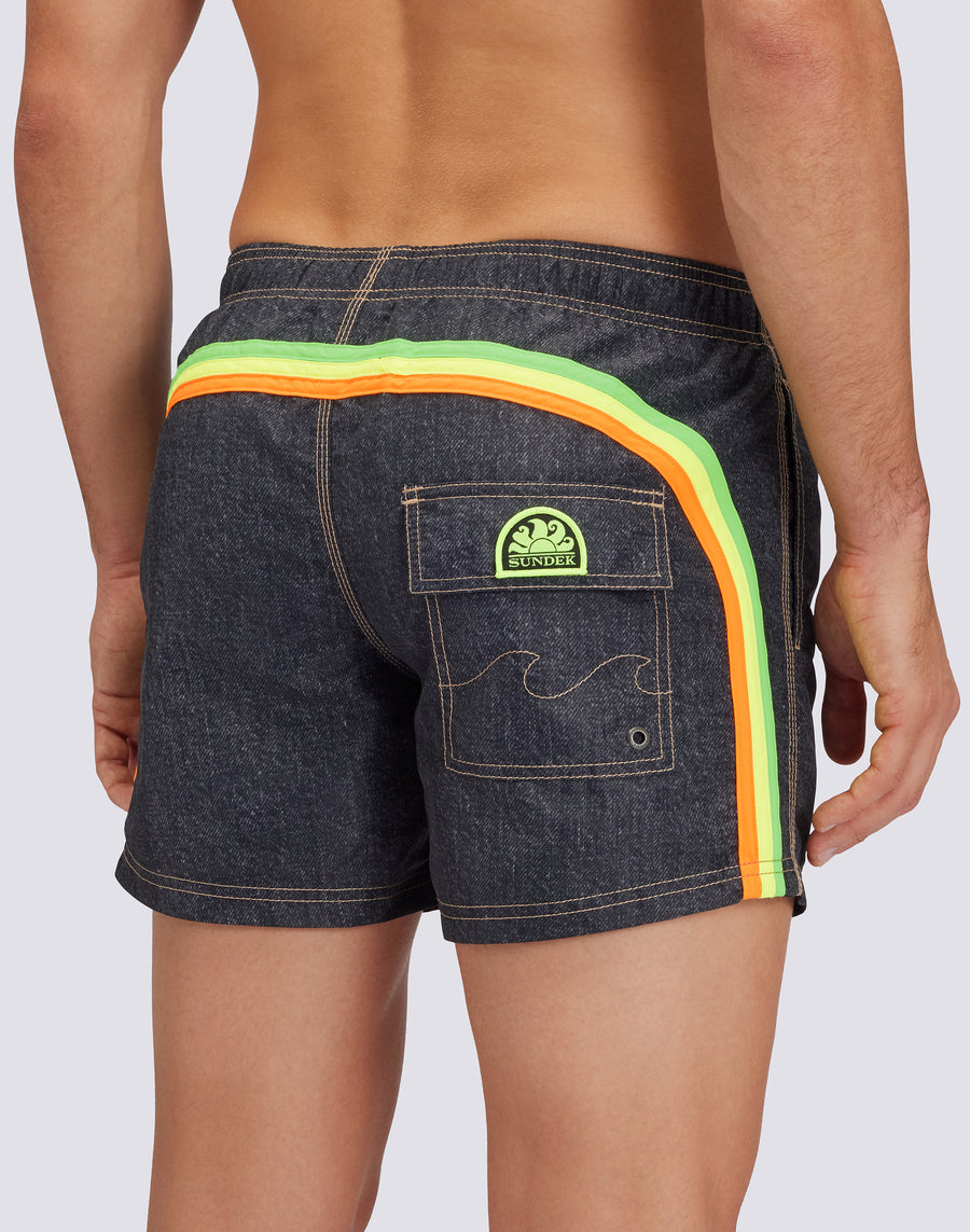 MAILLOT DE BAIN COURT TAILLE ÉLASTIQUE TAFFETA ICONIQUE GOLDENWAVE AVEC IMPRESSION DENIM