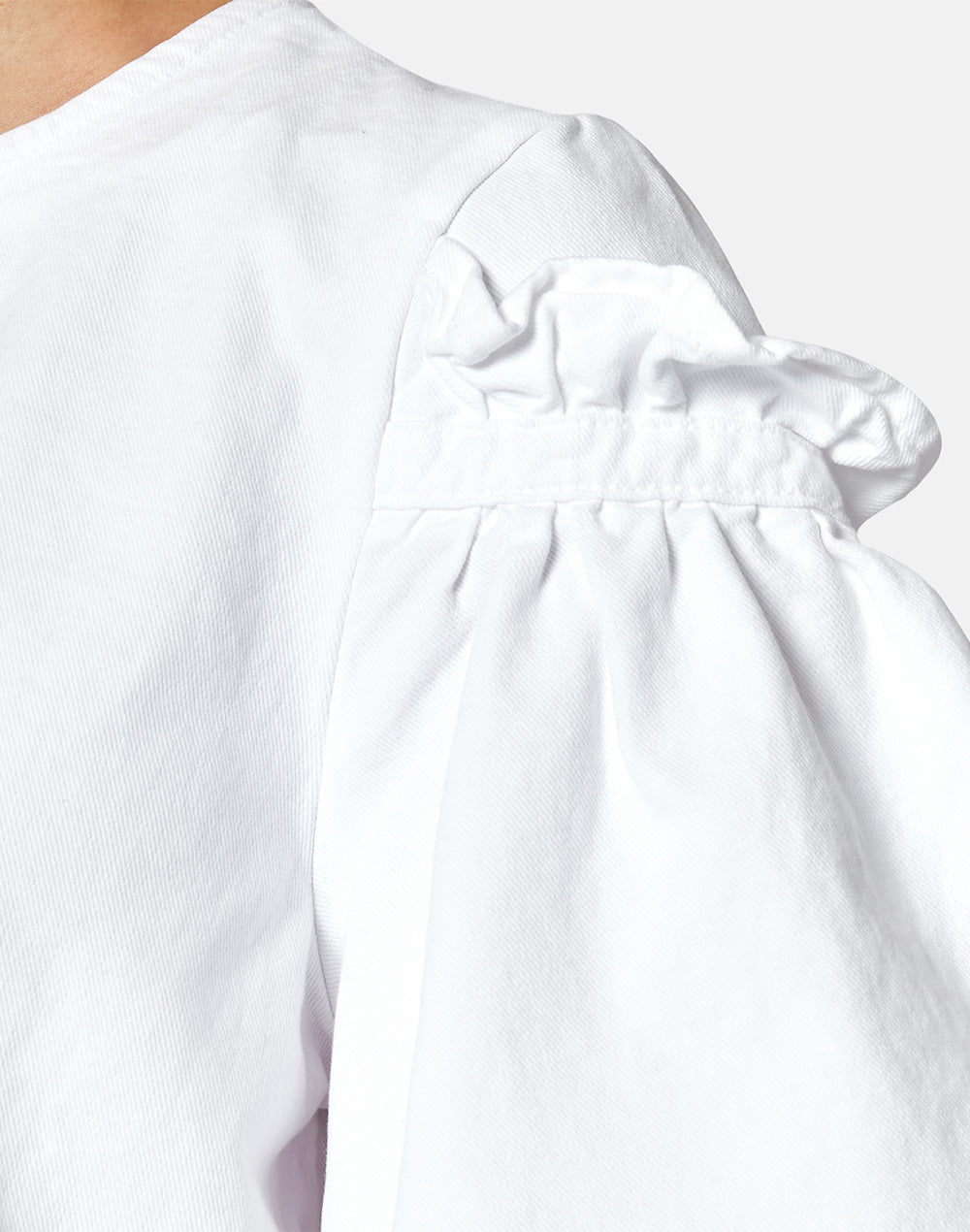 Blouse en bull de coton avec coupe évasée, caractérisée par des manches courtes en cloche avec ruché, et confectionnée dans un bull de coton doux et confortable.