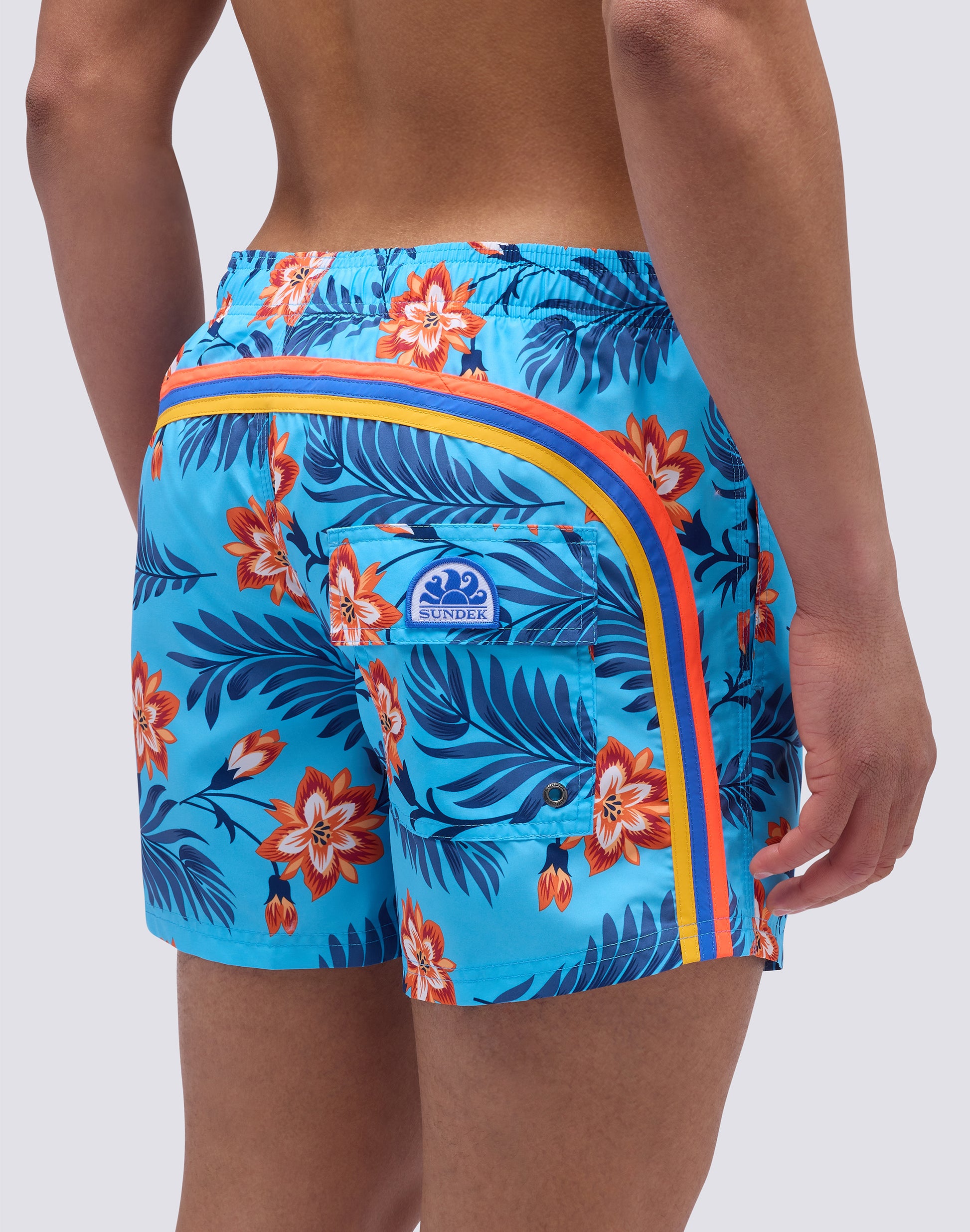 Maillot de bain pour homme en tissu polyester léger et à séchage rapide. Détail arc-en-ciel emblématique Sundek au dos et imprimé. Longueur extérieure de la cuisse 14”/35 CM (en taille M).