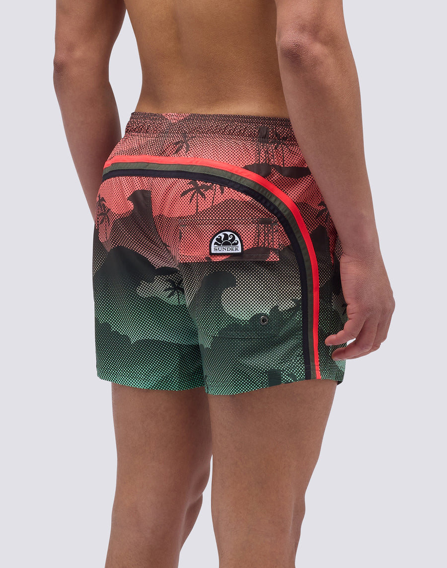 Maillot de bain pour homme en tissu polyester léger et à séchage rapide. Détail arc-en-ciel emblématique Sundek au dos et imprimé. Longueur extérieure de la cuisse 14”/35 CM (en taille M).