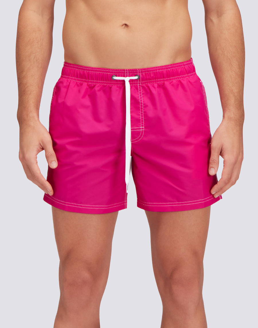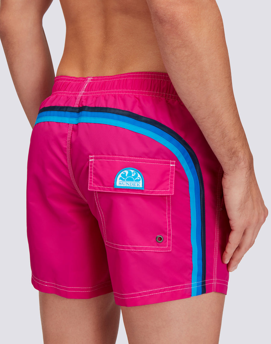 Short de bain court pour homme avec taille élastiquée, cordon de serrage et arc-en-ciel emblématique Sundek dans le dos. Ce maillot de bain est réalisé avec des coutures à trois aiguilles et 100% de notre tissu historique, le nylon-taffetas : doux comme de la soie, léger et résistant à tout, il sèche très rapidement pour vous offrir un confort partout, dans les vagues et en dehors des cascades. Longueur 35 cm (taille M), mesurée à l'extérieur de la jambe.