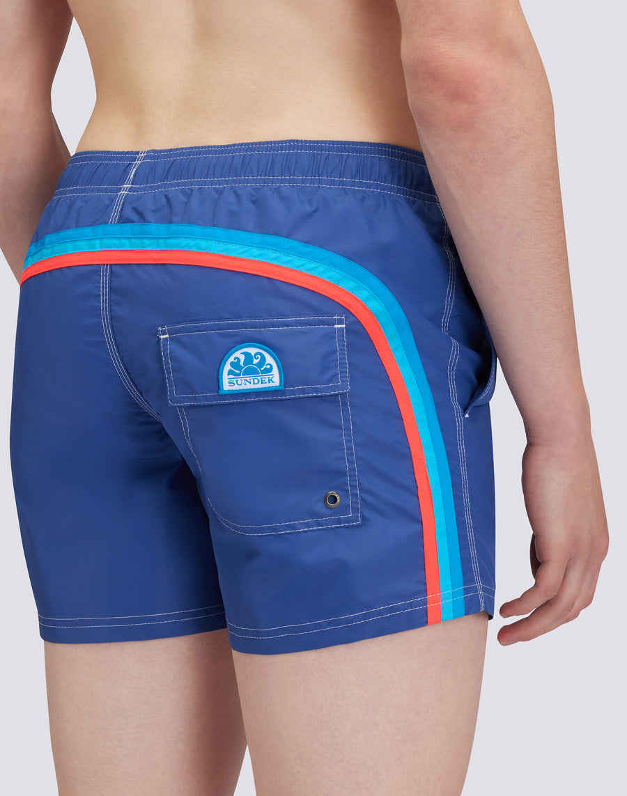 Short de bain court pour homme avec taille élastiquée, cordon de serrage et arc-en-ciel emblématique Sundek dans le dos. Ce maillot de bain est réalisé avec des coutures à trois aiguilles et 100% de notre tissu historique, le nylon-taffetas : doux comme de la soie, léger et résistant à tout, il sèche très rapidement pour vous offrir un confort partout, dans les vagues et en dehors des cascades. Longueur 35 cm (taille M), mesurée à l'extérieur de la jambe.