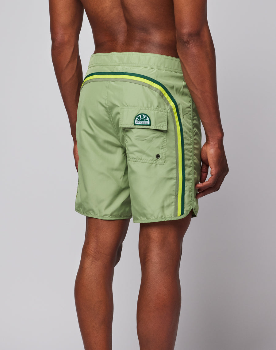 Maillot de bain long pour homme avec taille fixe, cordon de serrage et arc-en-ciel emblématique de Sundek dans le dos. Ce maillot de bain est fabriqué avec trois coutures à l'aiguille sur la zone la plus sollicitée pour une résistance maximale. Le tissu choisi est un polyester léger, pour vous apporter du confort partout, dans les vagues comme hors de l'eau. Coupe taille basse. Longueur 18"/46 CM (en taille 32).