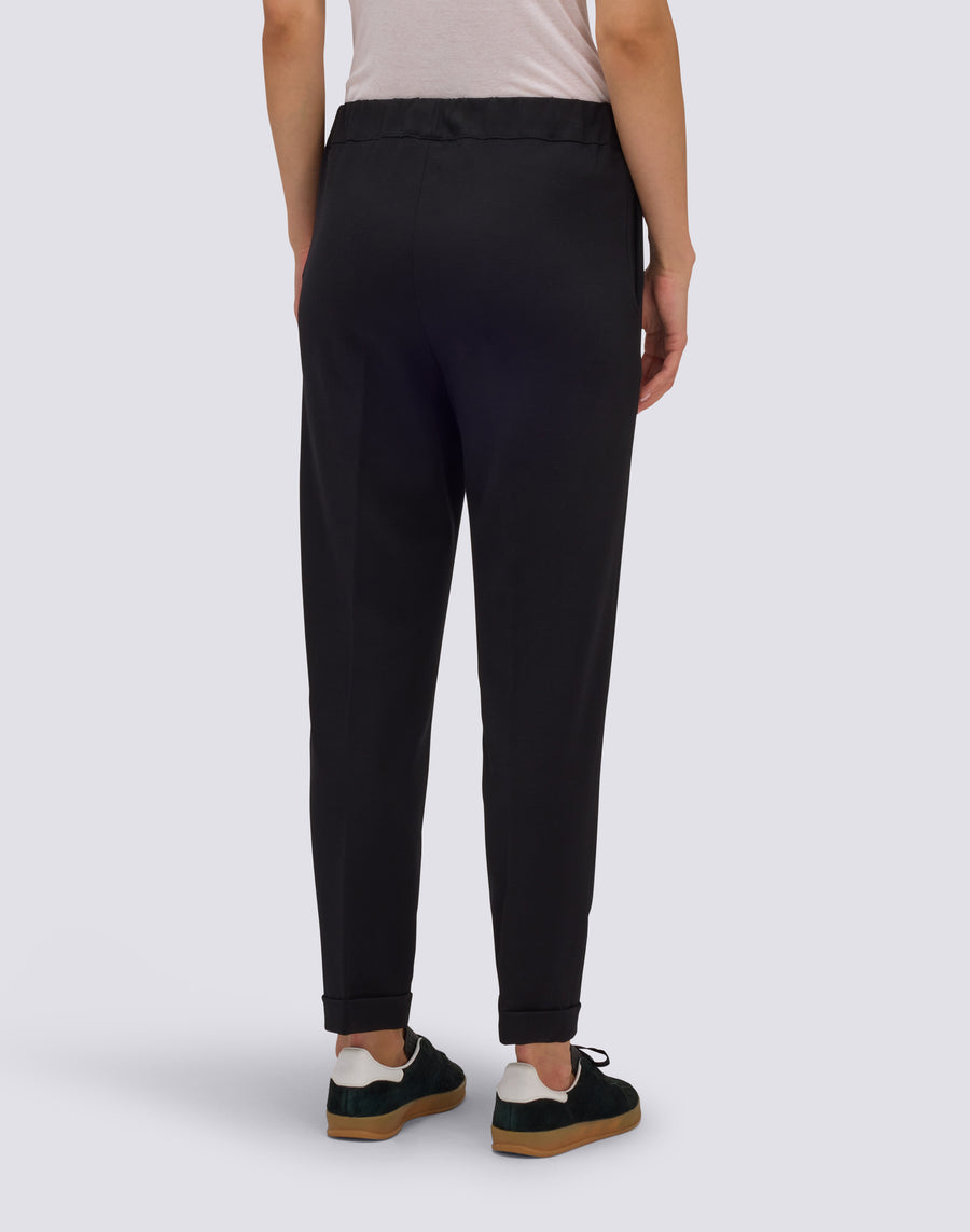 Pantalon femme en point milanais avec taille ajustable par cordon de serrage, poches latérales, pli central devant et ourlets à revers fixes. Coupe cigarette. Coupe slim.
