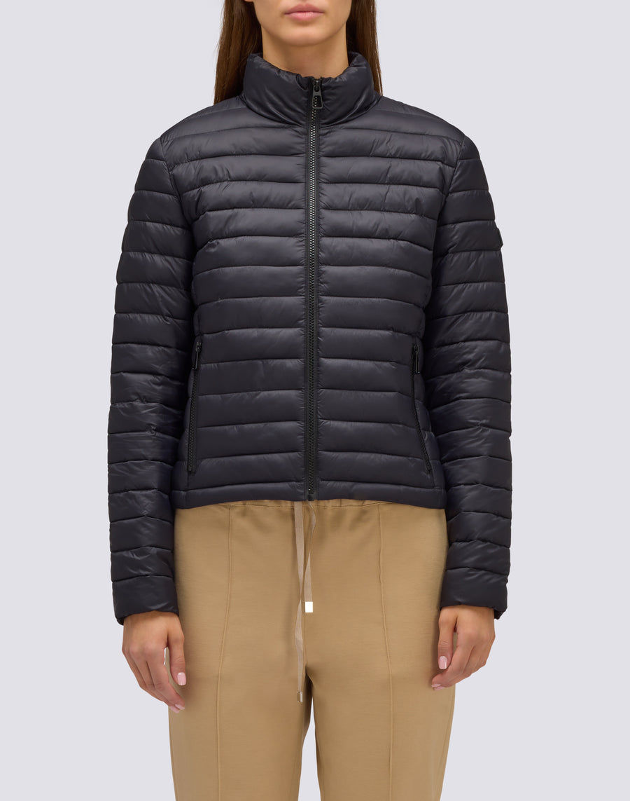 Pantalon femme en point milanais avec taille ajustable par cordon, poches latérales, pli central devant et poignets fixes. Coupe ajustée.