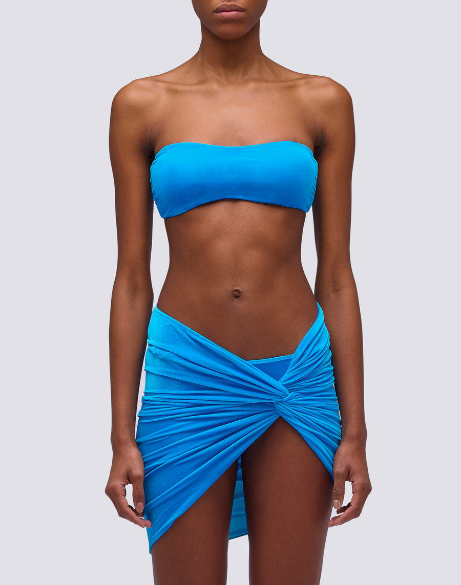 Paréo court en tissu velours léger, à porter sur l'ensemble bikini assorti, pour des tenues de plage raffinées et uniques.