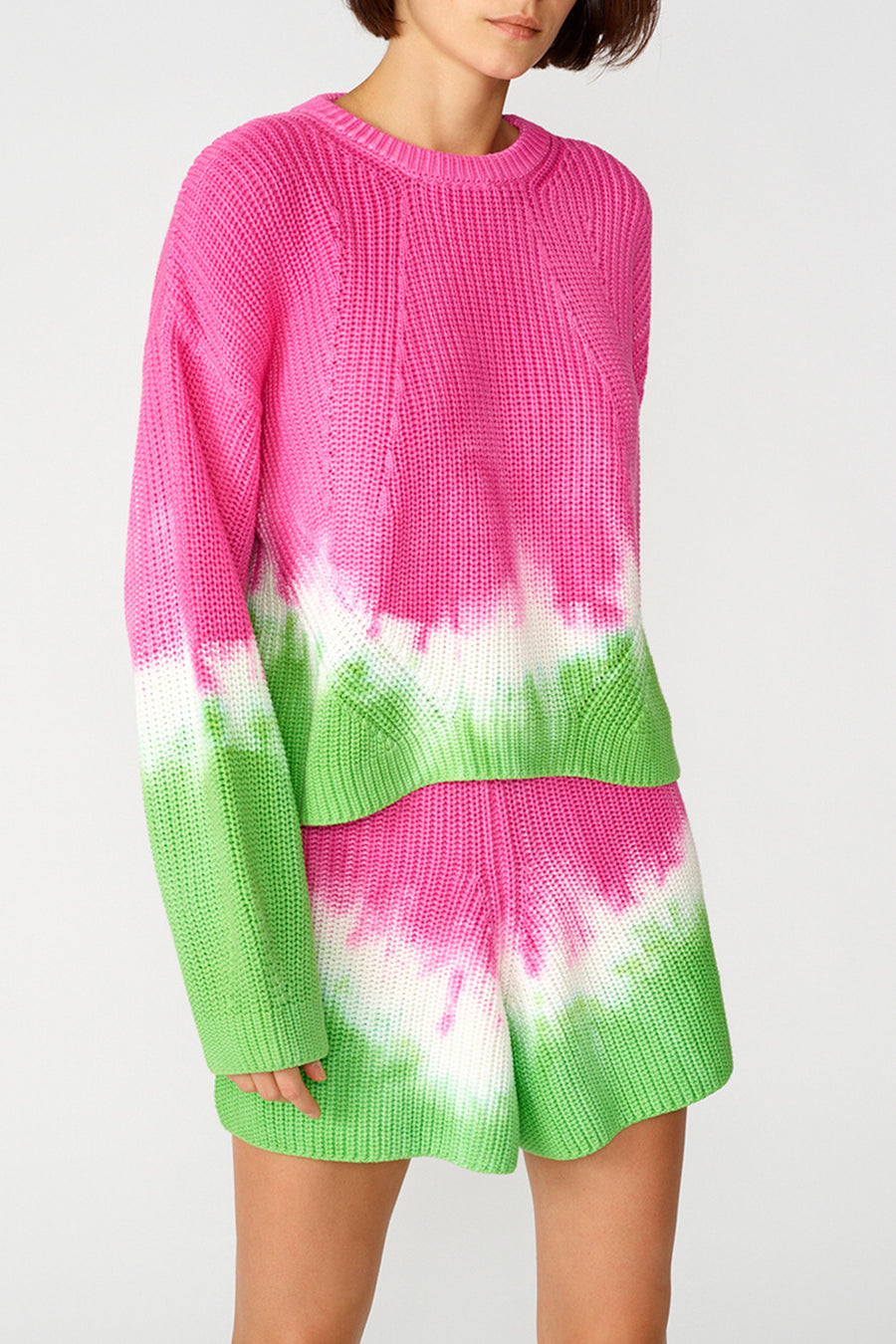 Laissez-vous inspirer par ce short en tricot de coton peigné en tie-dye multicolore. Illuminez votre printemps-été avec de la couleur !