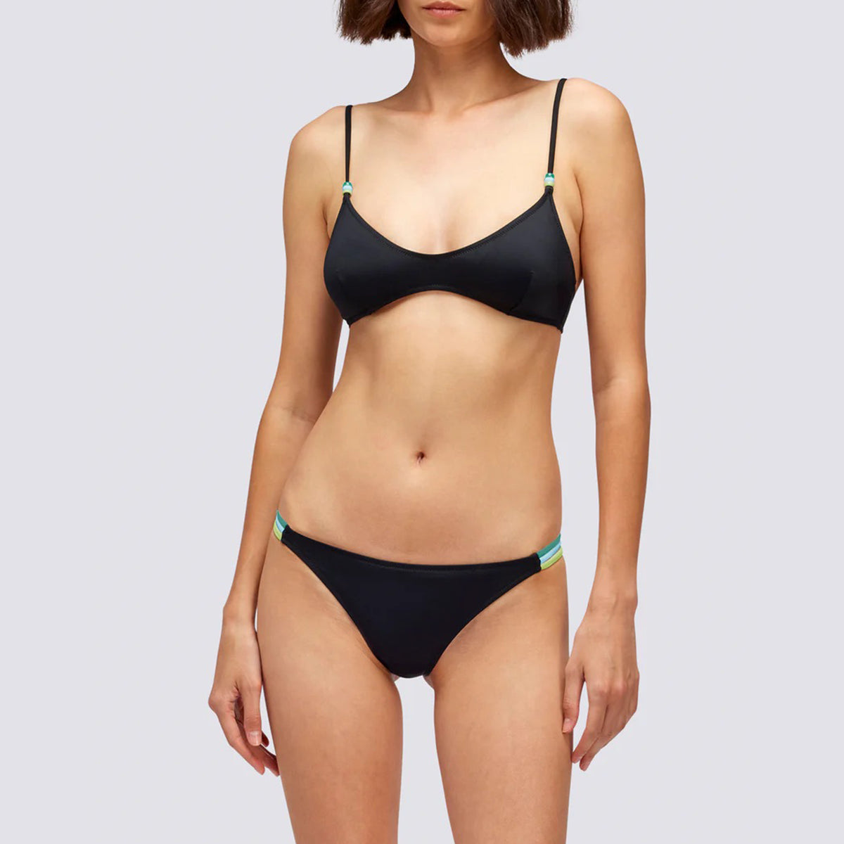 Un'opzione che unisce un tocco di tendenza nella parte superiore a un dettaglio regolabile in quella inferiore. La bralette offre un supporto leggero o medio, ideale per seni piccoli o medi. La mancanza di ferretto la rende molto comoda da indossare, la copertura è variabile, in base al modello. Il grande vantaggio invece dello slip a laccetti è quello di poter adattare la larghezza sui fianchi, rendendolo più o meno aderente e permettendo anche di giocare con l'altezza. A seconda del taglio posteriore, offre una copertura più o meno ridotta, mentre i laccetti mettono in evidenza i fianchi. Questo tipo di set bikini è particolarmente adatto a chi cerca un look alla moda e giovanile.
