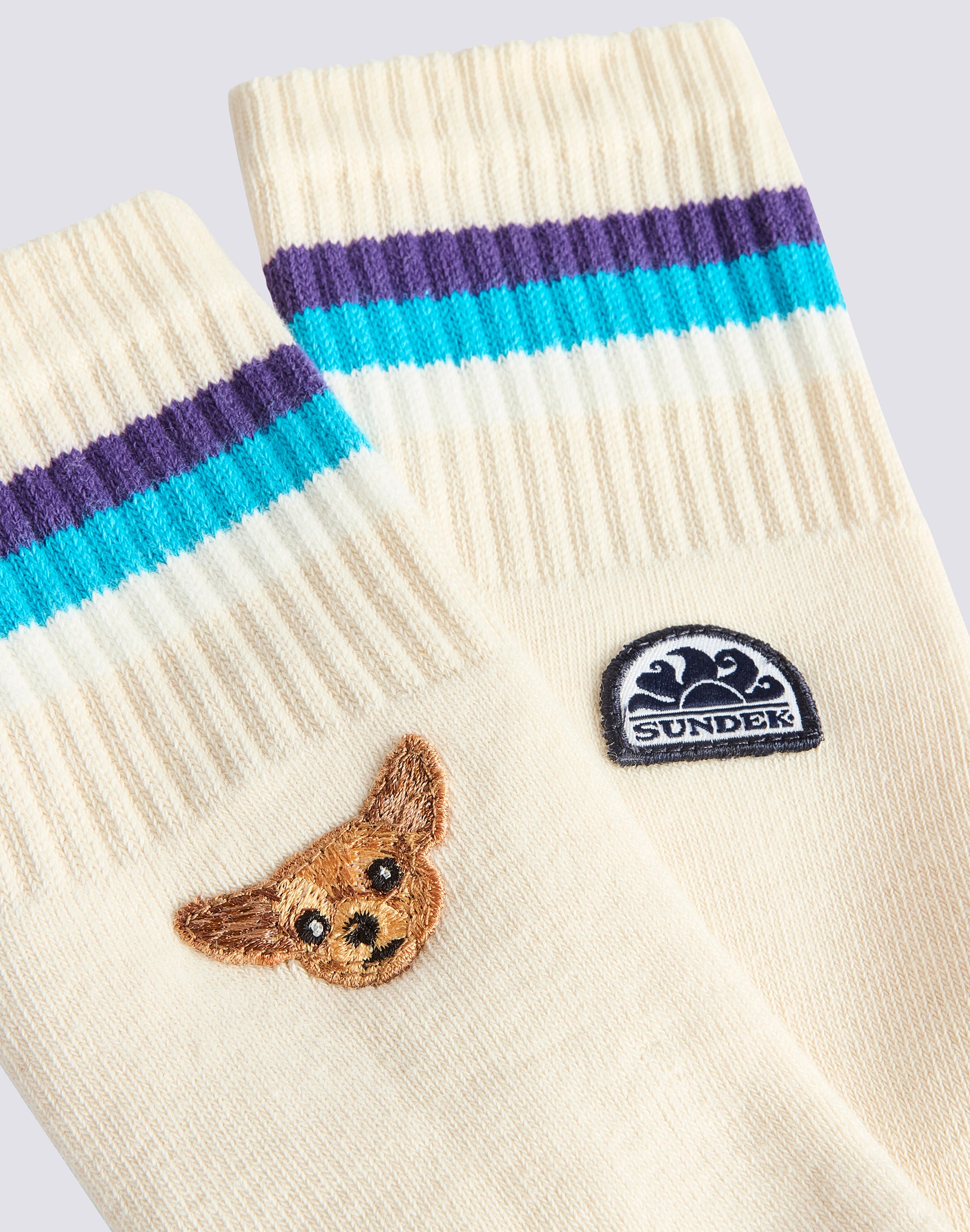 Calzino in cotone della capsule Sundek & Pelo Foundation, decorato con la patch del Chihuahua. Questo accessorio unisce comfort e stile, perfetto per gli amanti dei cani che desiderano esprimere la loro passione anche nei dettagli.