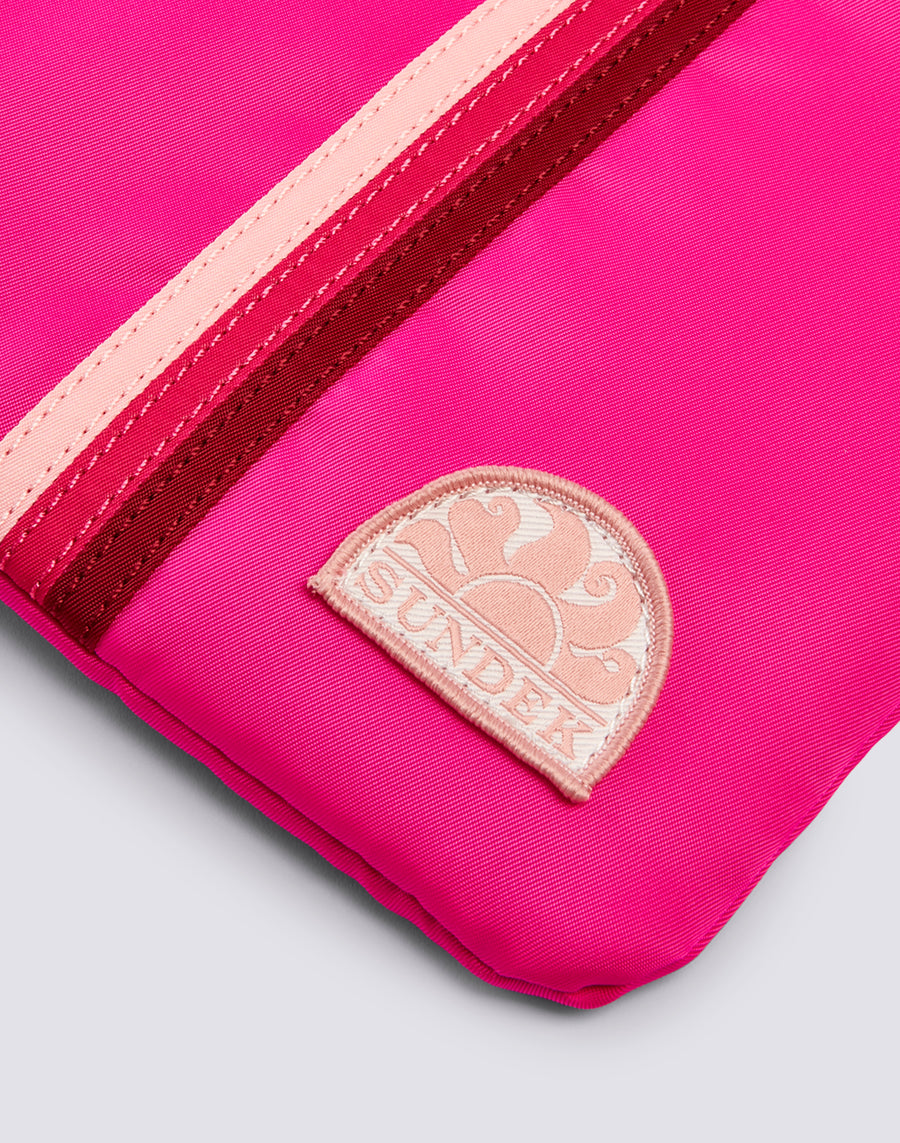 Pochette mare leggera e foderata con il dettaglio iconico dei nastri tricolore per custodire e proteggere l'essenziale che preferisci tenere a portata di mano. Perfetta da portare in borsa o da sola grazie alla pratica asola passamano.