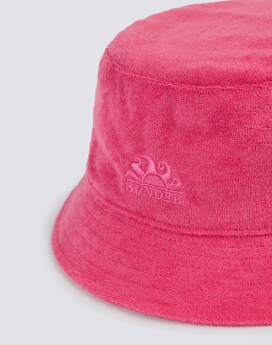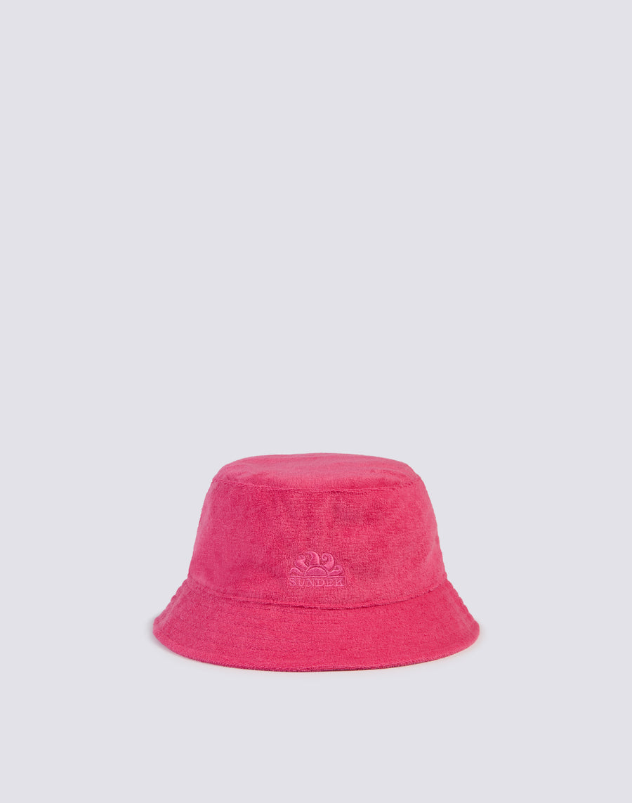 Cappello alla pescatora in spugna con cuciture decorative tono su tono e fascia asciugasudore interna, anch'essa in tono. Logo ricamato sul fronte. Un accessorio super carino, essenziale per completare i tuoi look da spiaggia.