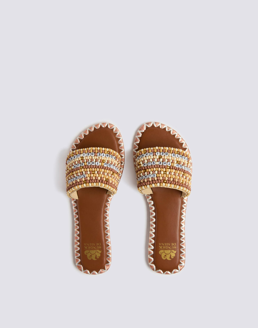 ESTERNO SUOLA 100% BUFFALO LEATHER INTERNO SUOLA 100% SHEEP LEATHER PERLINE DI VETRO 100% CUBETTI IN PLASTICA RAFFIA NATURALE 100%