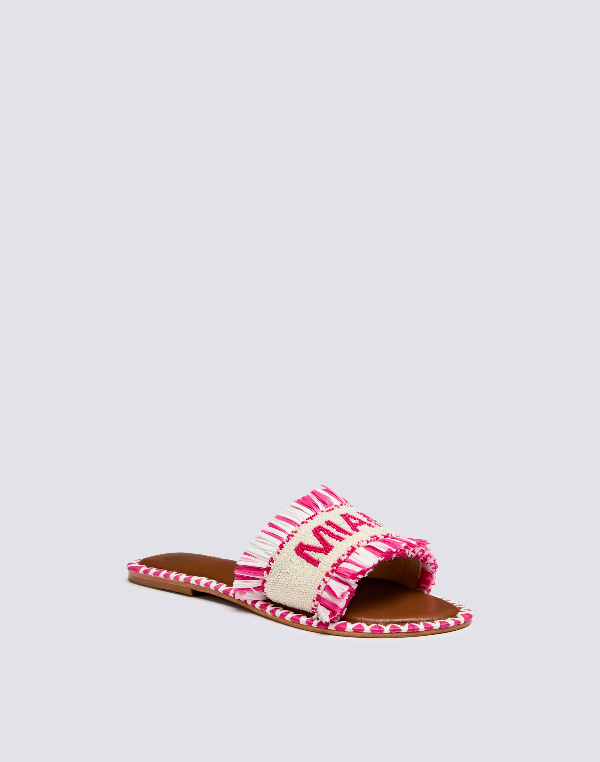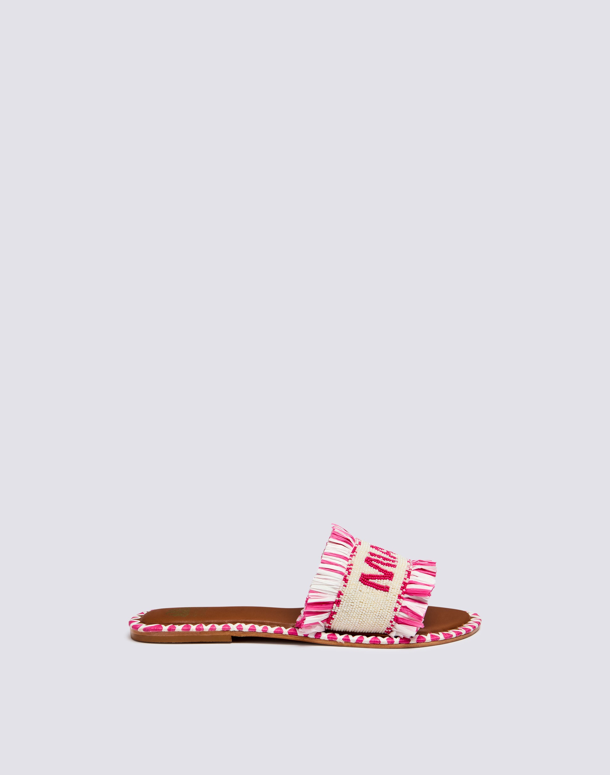 Ciabatta a fascia interamente ricamata di perline in vetro e profilata da frange in raffia colorata. La suola è in vera pelle con logo impresso color oro, anch'essa profilata da un ricamo artigianale in raffia.