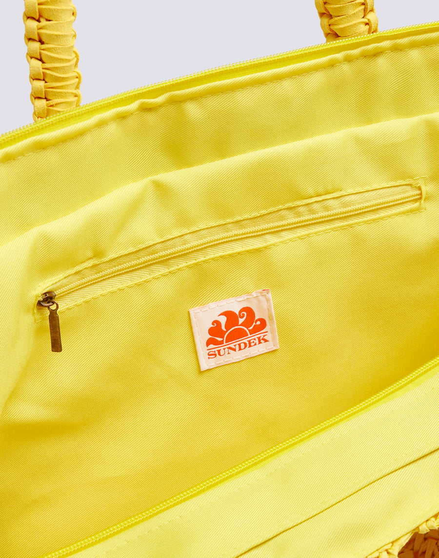 Elegante borsa in paglia intrecciata con logo ricamato e chiusura con zip. Dotata di mini tasca interna, è perfetta per la spiaggia o per una passeggiata in centro, per avere sempre con te tutto il necessario.