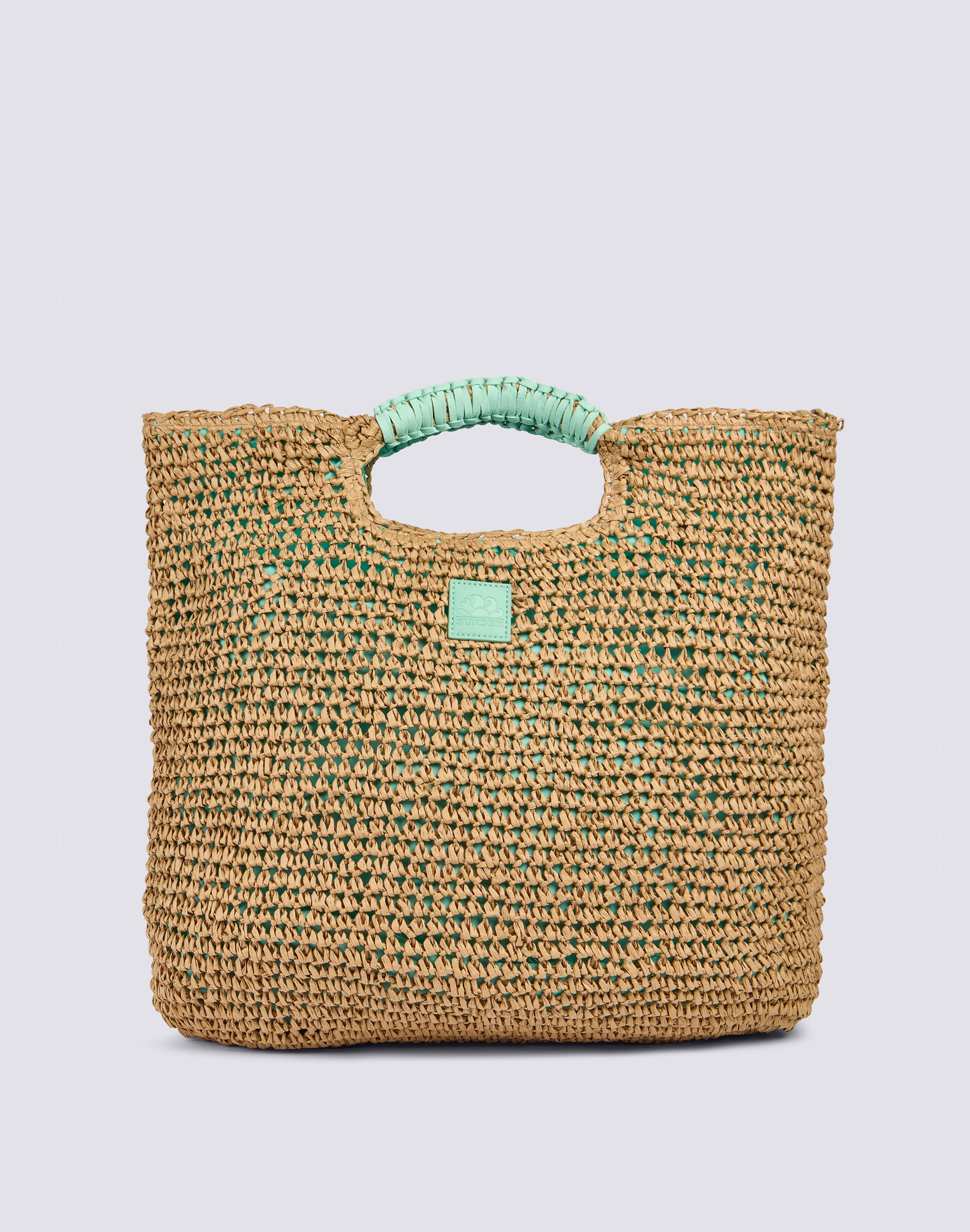 Shopping bag in paper effetto paglia con manici a contrasto. Capiente, dotata di chiusura con zip centrale, è ideale per una passeggiata o come borsa mare.