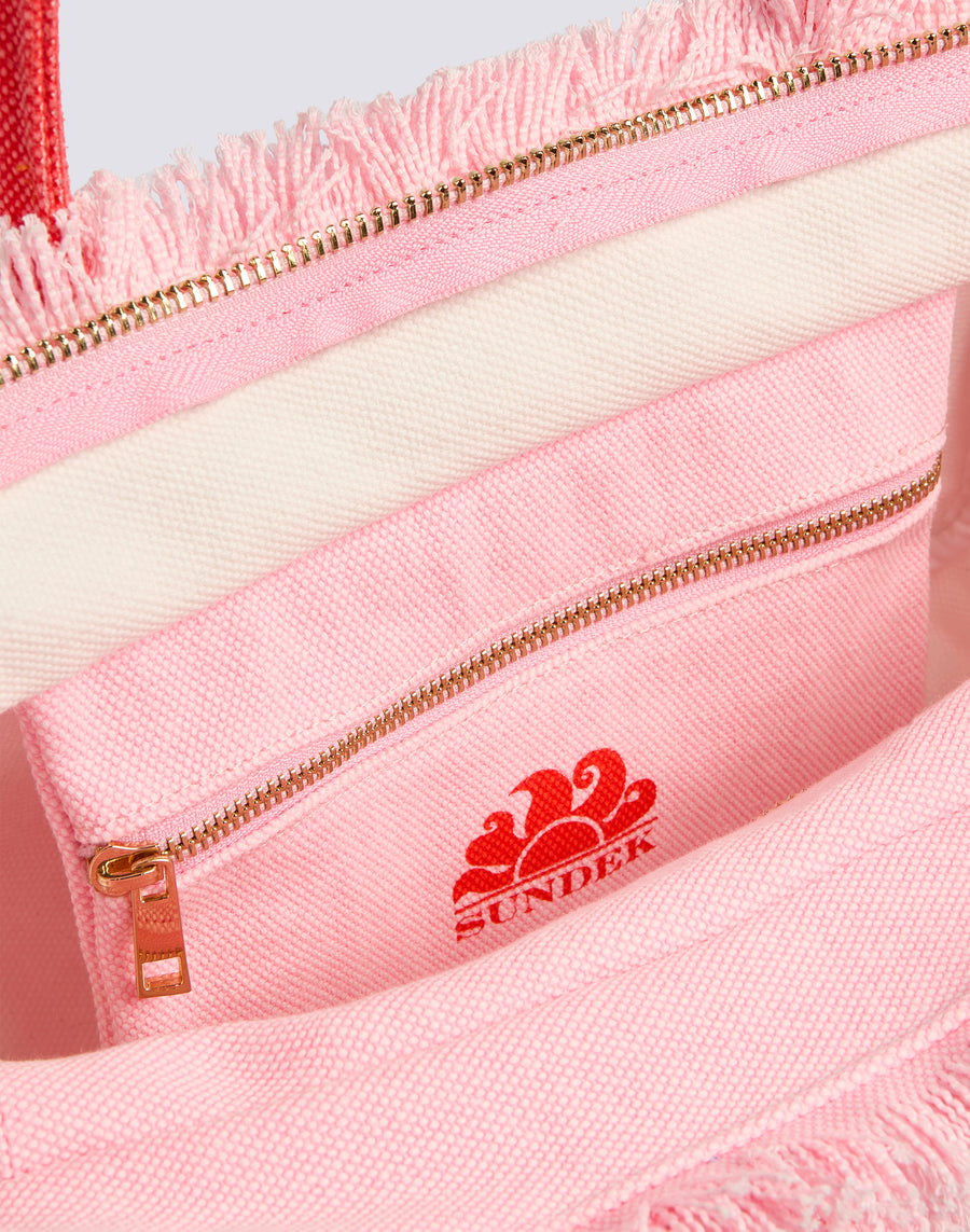Tote bag formato regular con effetto stone washed, zip centrale, logo grande stampato e rifiniture in oro. Il dettaglio delle frange rende questo modello adatto a look decisi.