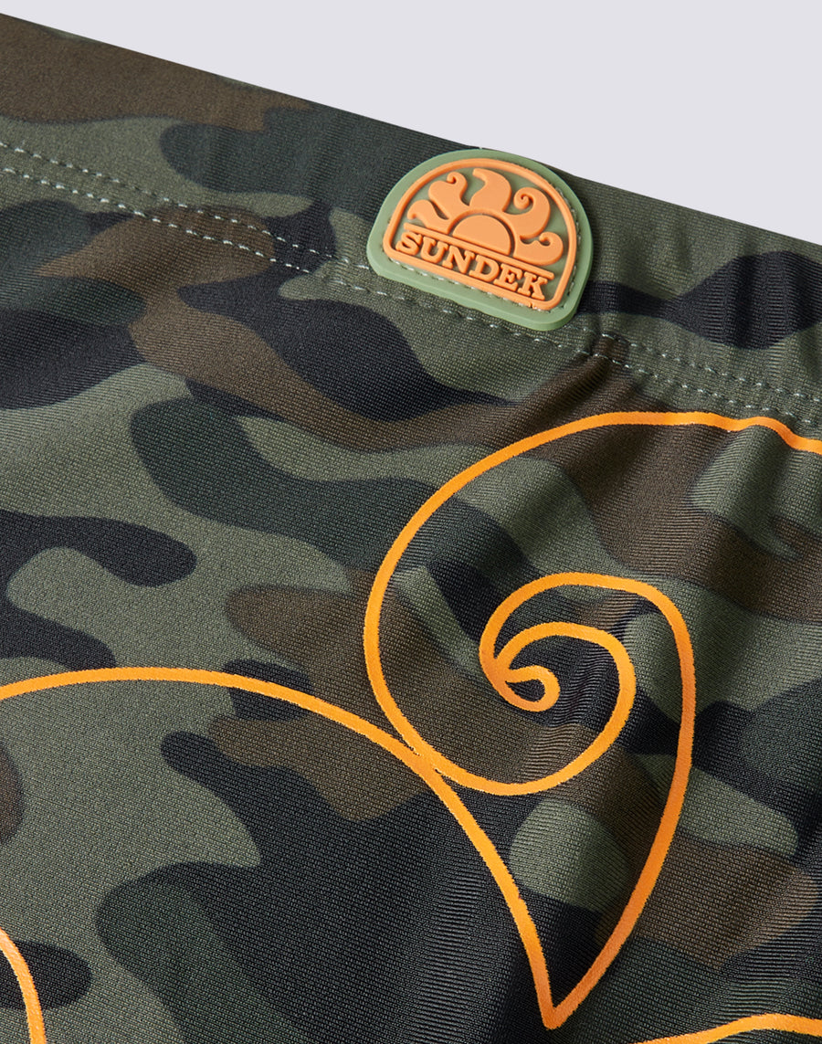 Slip da bambino con stampa camouflage, coulisse e vita elasticizzata per una migliore aderenza. I fianchi sono caratterizzati da strisce verticali in 3 colori. Sul retro spicca il logo Sundek a contrasto. Lunghezza esterna 2,5"/6cm (in taglia 6 anni).