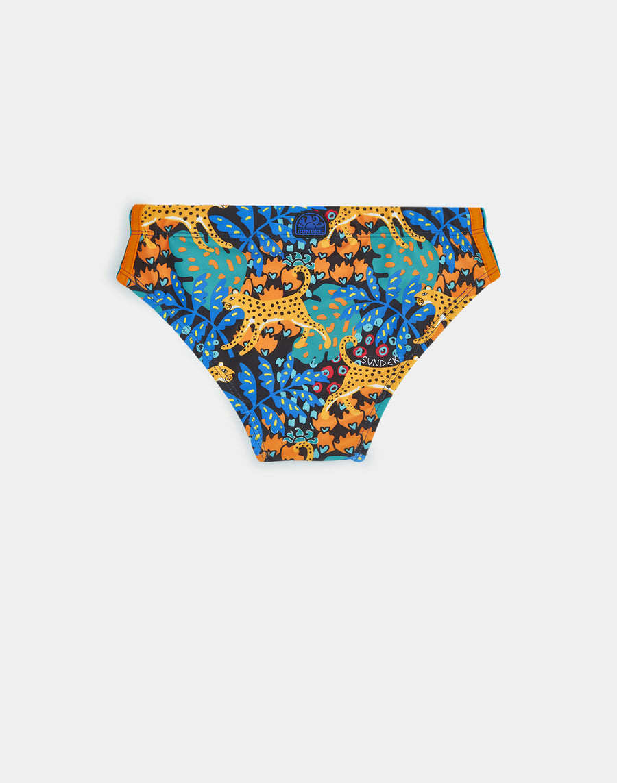 Slip da bambino con vivace stampa leopop, coulisse e vita elasticizzata per una migliore aderenza. I fianchi sono caratterizzati da strisce verticali in 3 colori. Lunghezza esterna 2,5"/6cm (in taglia 6 anni).