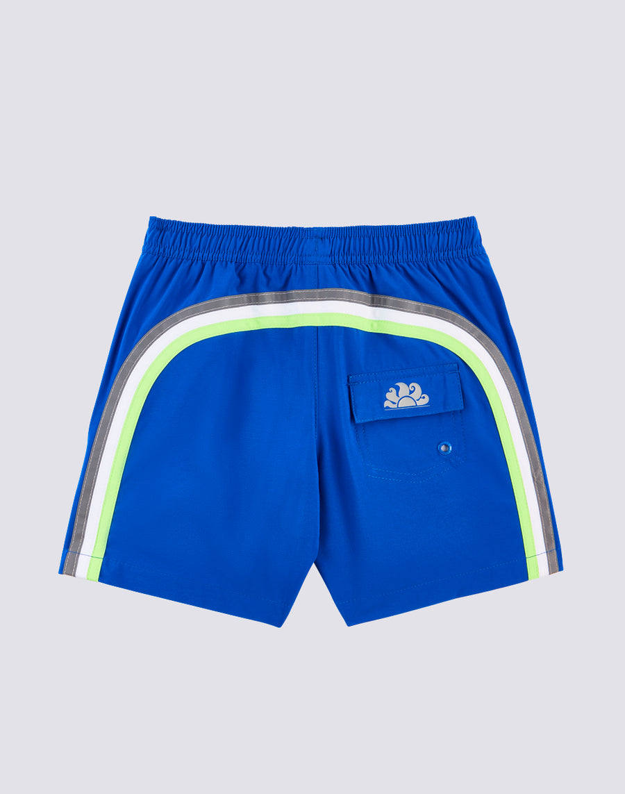 Colore intenso e tessuto iper-confortevole ad asciugatura rapida per questi pantaloncini mare bimbo. Un modello che accompagnerà il tuo bimbo nelle sue mille attività in vacanza, perfetto per muoversi e giocare in piena libertà. Leggero, resistente, si asciuga rapidissimo ed è realizzato in tessuto 4 Way Stretch. Ha le nostre classiche cuciture a tre aghi che aumentano la resistenza nel tempo e il nostro arcobaleno iconico sul retro.