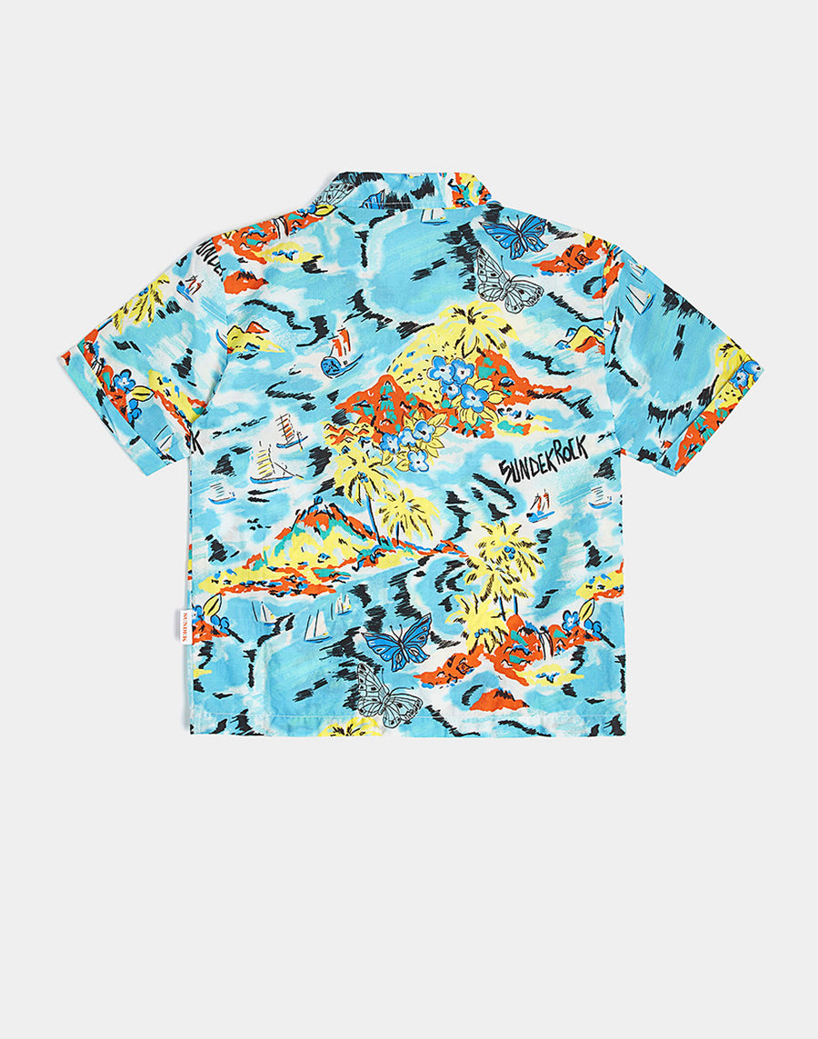 Tuffati nelle fantasie Sundek. Camicia da bambino a maniche corte con stampa all over a ispirazione marina. Realizzata in cotone muslin, fresca e confortevole, da indossare per giocare e correre all'avventura!