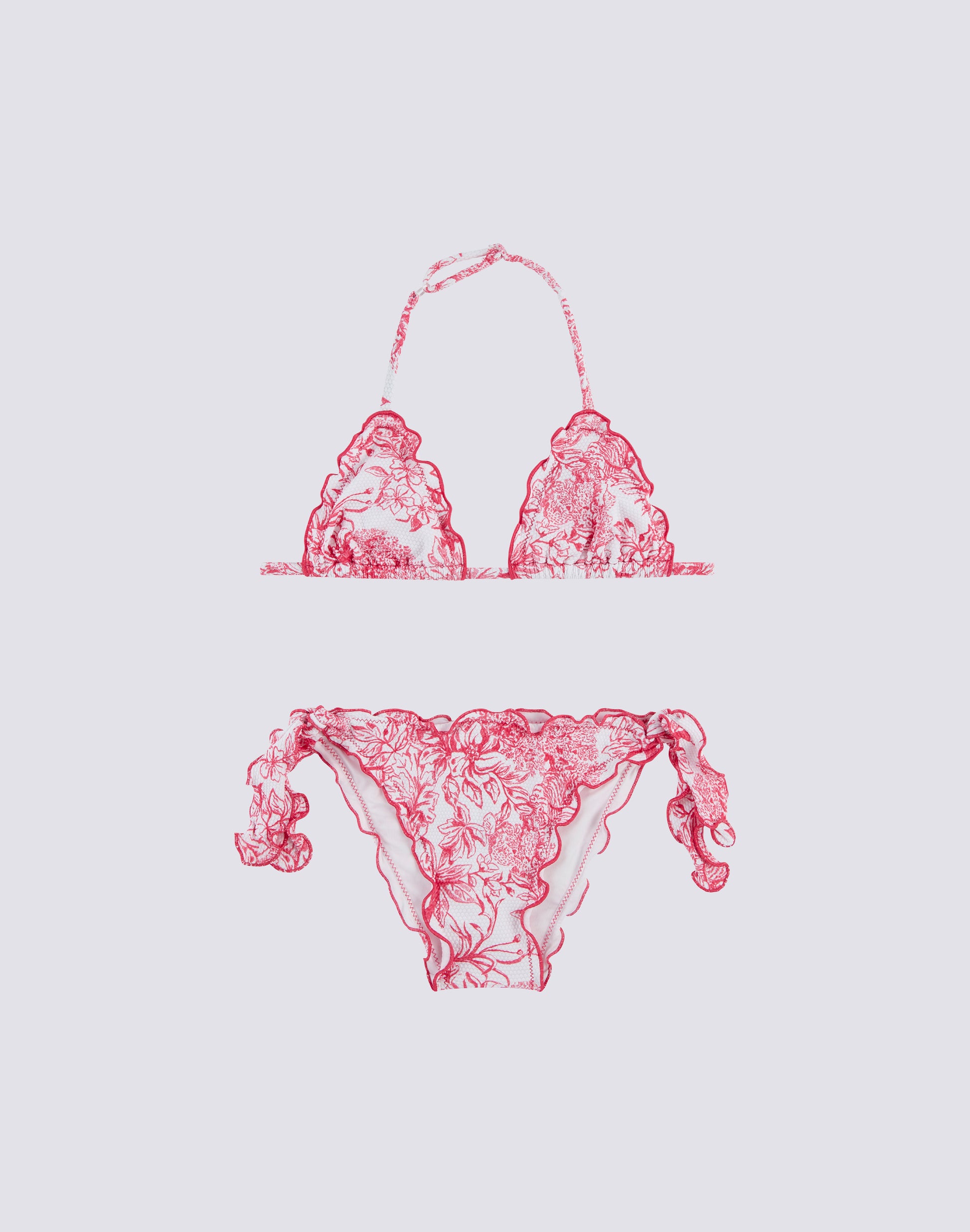 Mini bikini Magnolia formato da top arricciato a triangolo regolabile e slip arricciato con fiocchi. Stampa Fleur de Joie e tessuto Piquet. Modello in coordinato con quello della mamma per sfoggiare un look mix& match sulla spiaggia.
