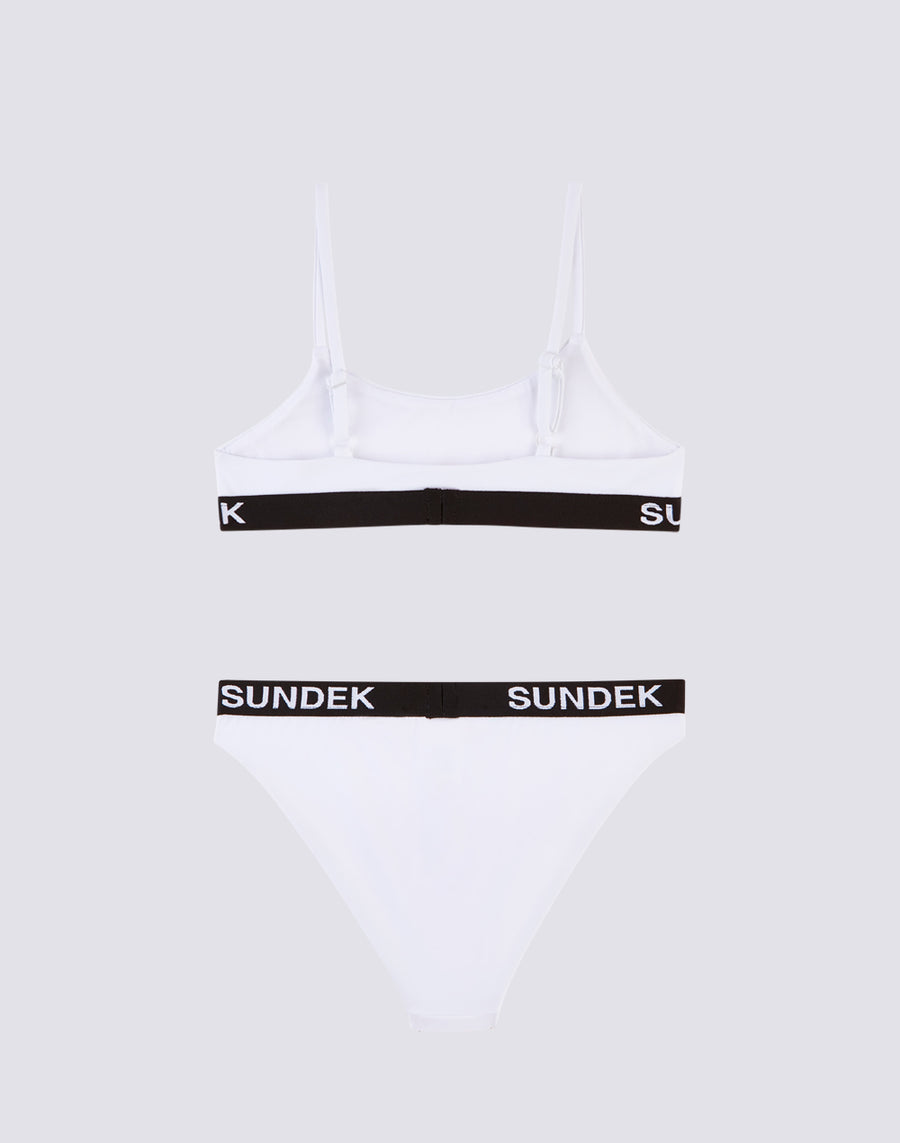 Scegli per la tua bimba questo bikini composto da top a fascia e slip con elastico, personalizzati dal logo a contrasto. Il tessuto ecosostenibile, morbido e resistente è adatto a mille bagni e giochi in spiaggia.