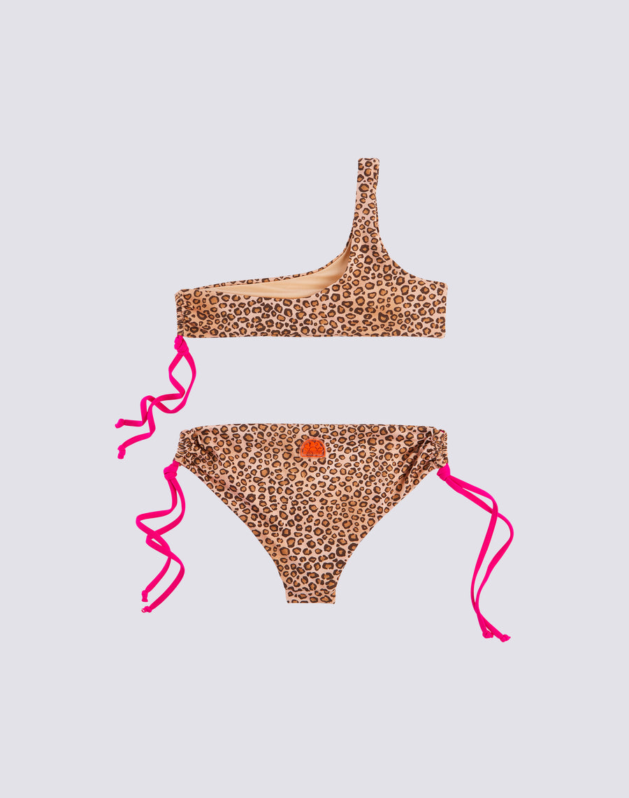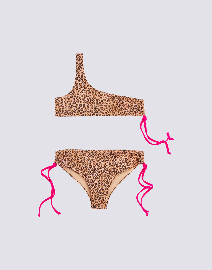 Un look trendy per le piccole fashioniste: il bikini monospalla con stampa leopardata e lacci a contrasto regolabili offre comfort e stile. Il top può essere indossato con un solo spallino o con una spalla sguarnita per vari stili, mentre i lacci permettono una vestibilità perfetta. Goditi il divertimento al sole con la tua bambina!