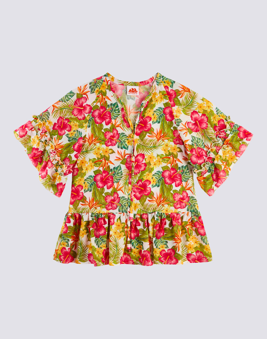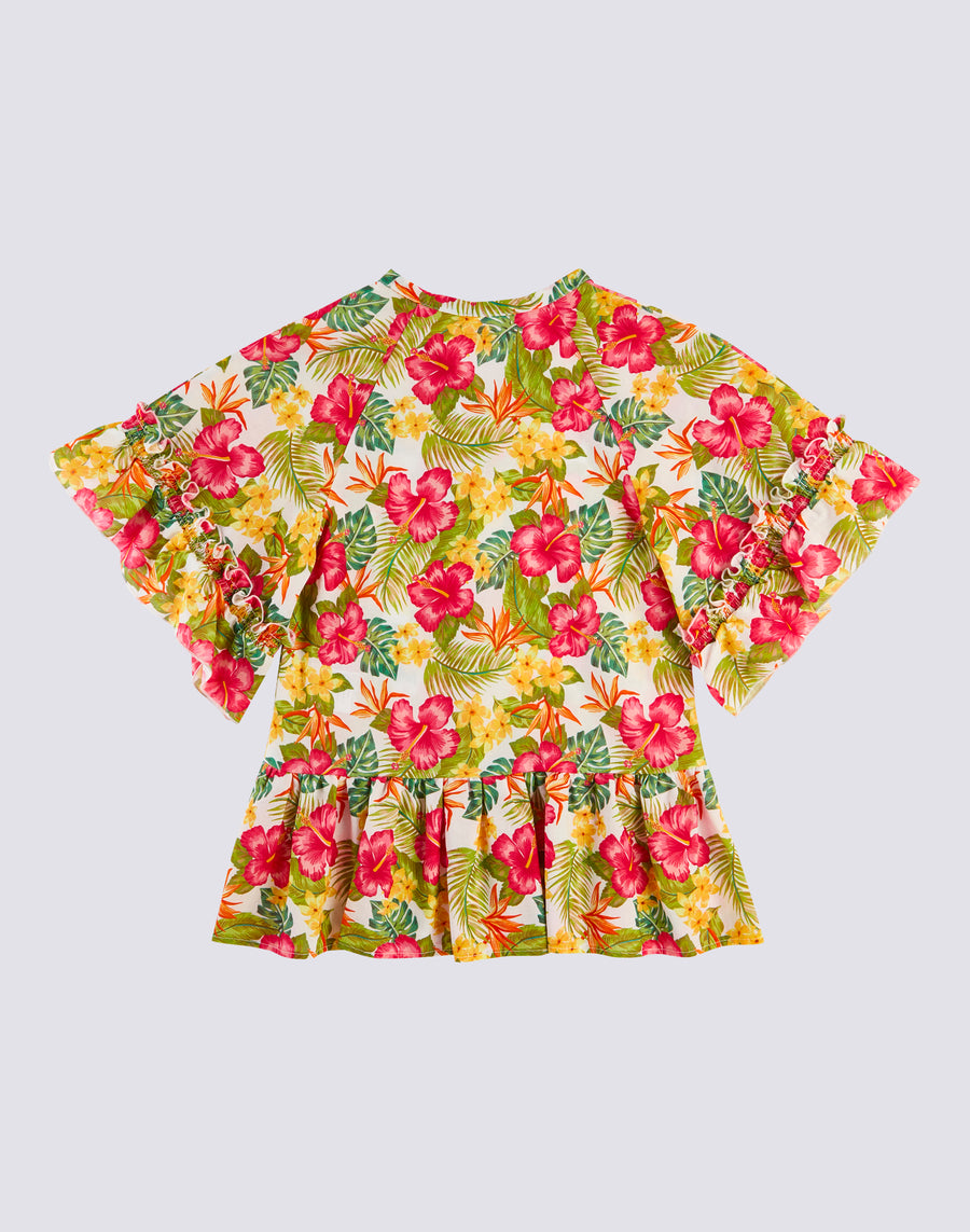 Mini kaftano in cotone stampa tropicana con maniche a taglio ampio, spacco a V frontale e lacci con perline.