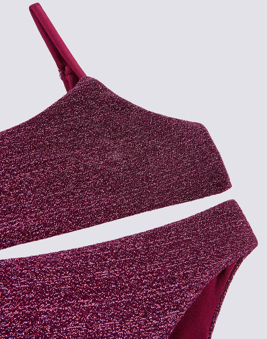 64% PA 36% EA Tessuto in lurex brillante, confortevole e con fodera che garantisce un contatto morbido con la pelle.