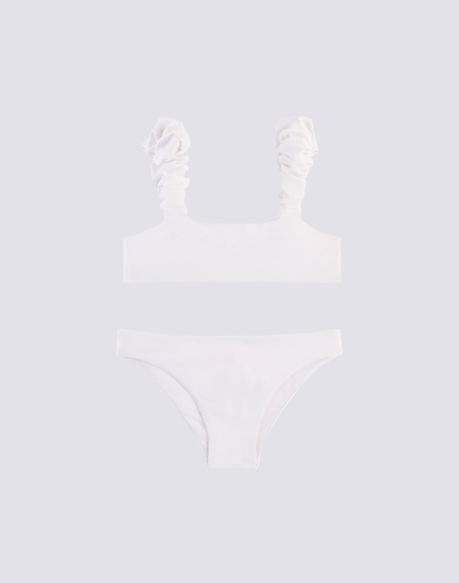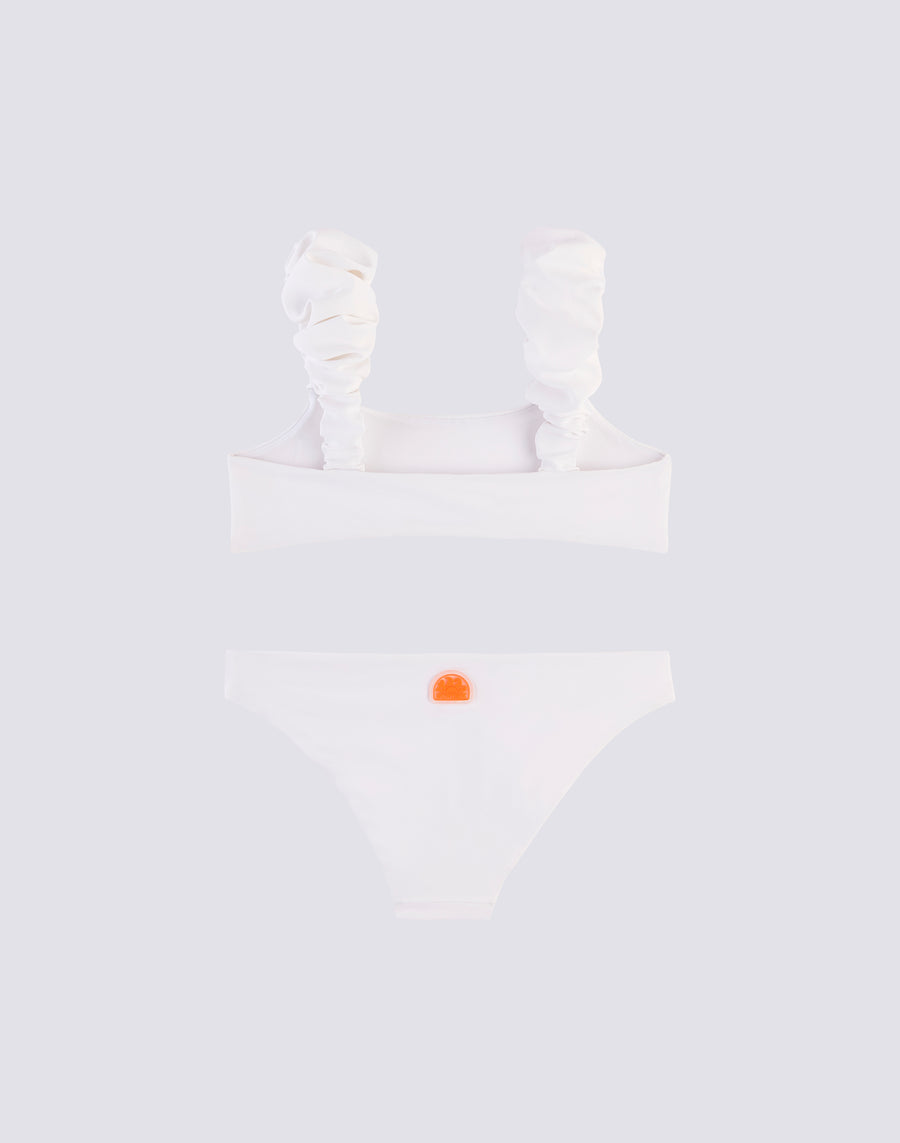 Elegante bikini composto da top con rouches e slip fisso. Per bambine che non vogliono passare inosservate.