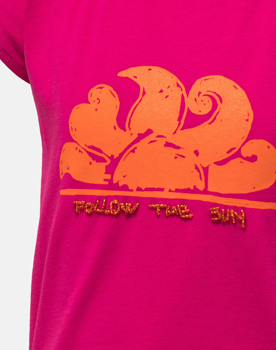 Una t-shirt divertente e versatile da indossare tutta l'estate con tanti capi diversi: senza maniche, con taglio cropped e nodo centrale e scritta logo Sundek centrale ricamata con perline.