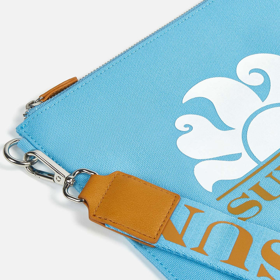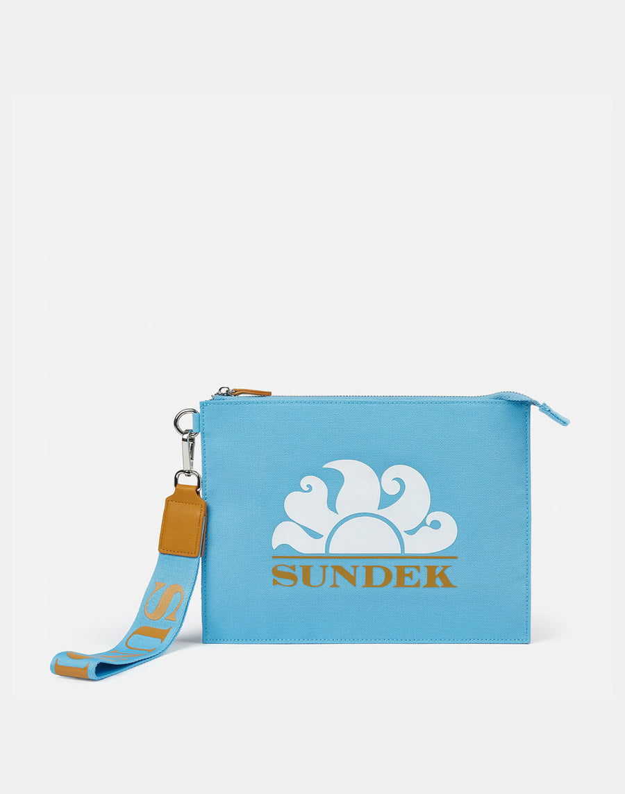 Clutch in canvas con logo sundek stampato.Perfetta sia come necessaire che da portare come pochette legata al polso. Laccetto con logo rimovibile. Misure: 27 x 20.5cm