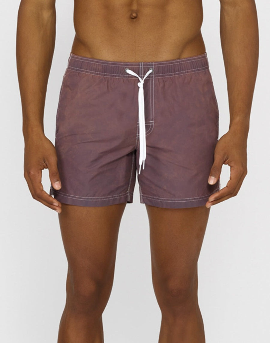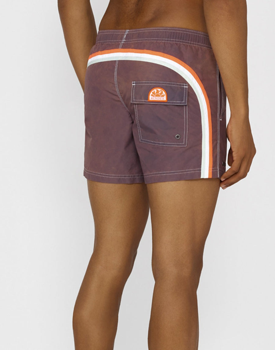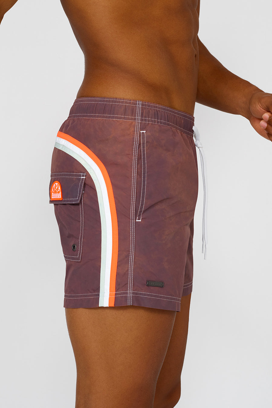 Preparati a cavalcare la prossima onda con il costume da bagno corto a vita elasticata. Grinta e carattere convivono in questo modello dalla vestibilità a vita bassa, realizzato in nylon taffeta con trattamento stone wash effetto vintage. Lo storico tessuto dei costumi Sundek rendono il costume leggero e veloce nell'asciugatura.
